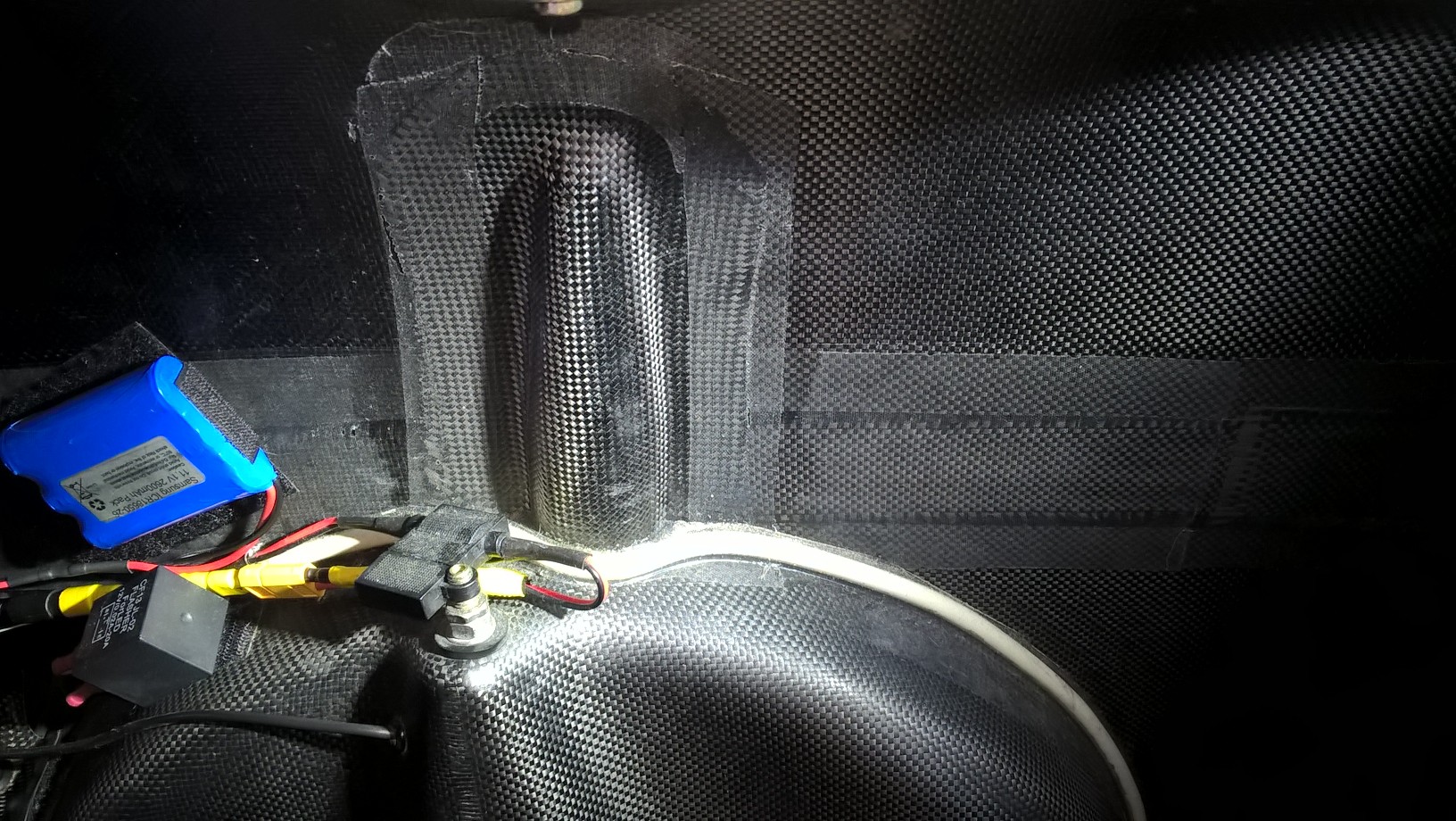 Oikeilla jäljillä olet. Ohessa kuvat tuosta minun pyörästä. Hankala kyllä tosiaan tuo sähköjohto. Lienee kuitenkin paras jättää johto paikalleen ja loveta jäykistettä tuolta nurkasta hieman?