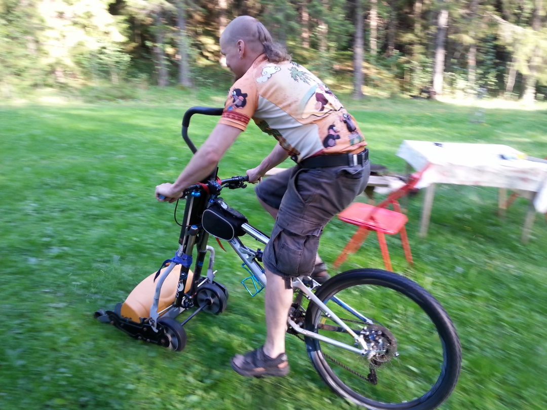Muoks. Niin, apupyörät toi saattaa tarvita kun on maa kallellaan oikealle ja kääntyy vasemmalle, tykkää pyörä kallistua mutta jahka pääsee leikkurin työntötangosta eroon niin on helpompompi vartalolla kallistella.