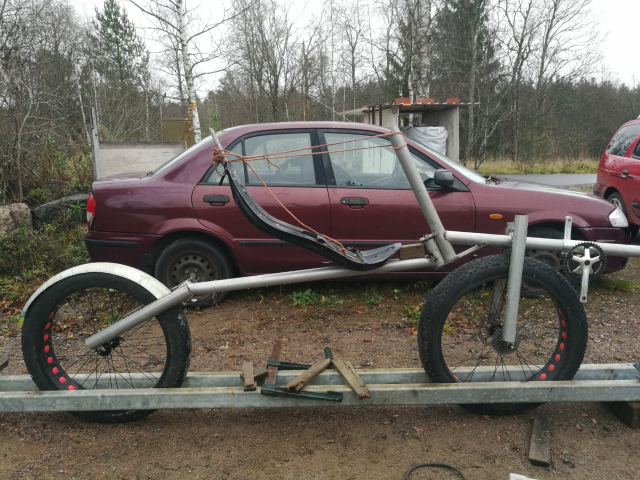 Haarukkaputketkin teipattu kiinni, keskiö kelkkaputkessaan - penkki vasta narulla mallattavana.