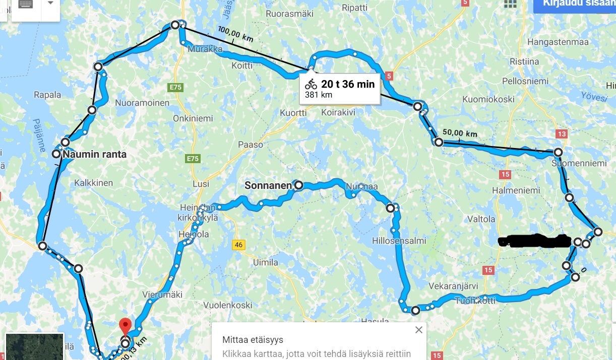 Sitä en vielä tiedä tuleeko opaskirja, matkakirja, satukirja vai romaani jossa keski-ikäistyvä mies kaipaa rakastaan tai sitten kaikkia noita yhdessä. Koska yleensä ihmisillä ensimmäinen lähteminen pyörämatkalle on vaikeaa ja metsässä yöpyminen jokamiehenoikeuksista huolimatta pelottaa niin piirtelen reitit virallisten luontokohteiden kautta jossa on tulipisteet ja "palvelut", ajella meinasin joka toinen päivä n. 60 km ja olla siis pääosin 2 yötä samassa paikassa päivät luonnossa oleillen ja käpötellen. Josko siinä samassa löytäisin sen rauhallisuuden ja leppoisuuden minkä kiireessä ja väsymyksessä tunnen kadottaneeni, sen jälkeen löytyy yleensä se tekemisen ilo ja ideat.