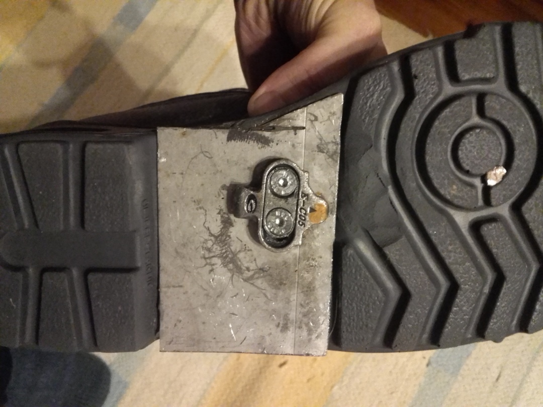 Tuossa kuvassa oleva rautalätkä on sopivan kokoinen, toiseen kenkään tuli sentin lyhyempi ja klossi on ihan raudan reunassa. Kun kengillä oli päivän polkenut niin klossi ja rauta oli painunut kengänpohjaan ja klossia ei saanut enään polkimeen kiinni. Piti vähän vuolla kengänpohjaa lisää.