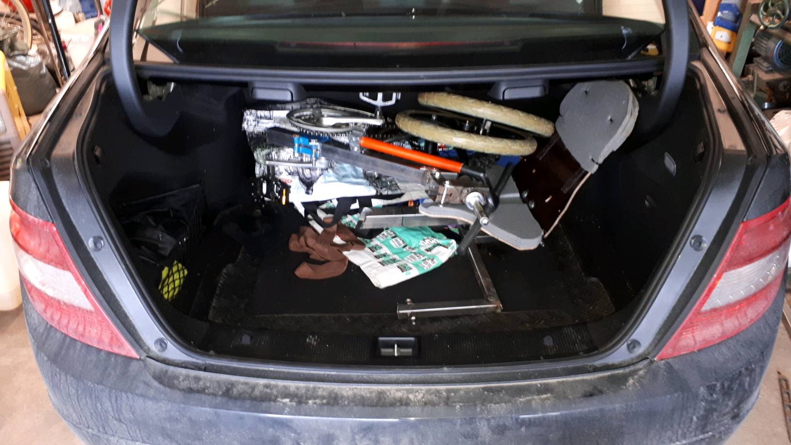 Tuohon kun ompelisi venyvästä kankaasta tai verkosta riippumaton niin, että toiseen päähän ommeltu tasku vedettäisiin istuimen selkänojan yläosan päälle ja toinen pää pujotettaisiin takasillan takapuolen ympäri ja kiinnitettäisiin yhdestä kulmastaan etuhaarukan ylätyveen, tulisi pyörään näppärä katettu tavaratila istuimen taakse ja alle.