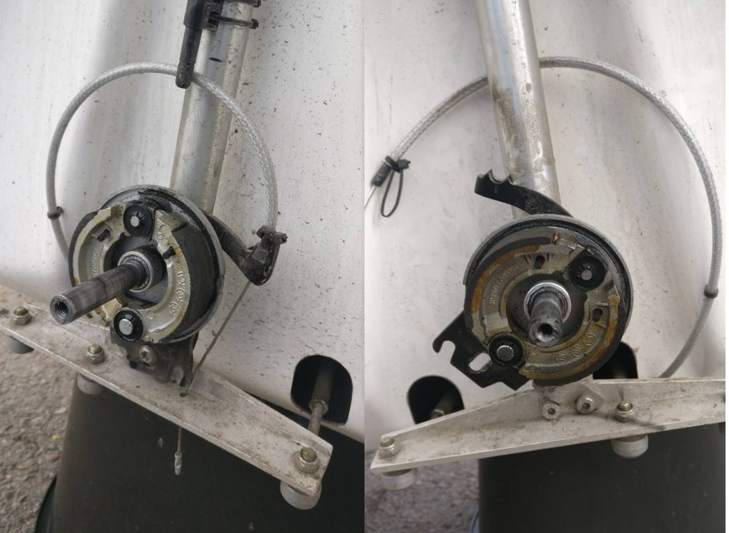 Oikea etujarru sökö. Ruuvi pudonnut ja rumpujarru irti. Seurauksena myös vaijerin katkeaminen. Ihmettelen miten tuo on edes mahdollista. Laitan vertailuksi vasemman toimivan jarrun. En ihan uskalla yhdellä jarrulla lähteä kurvailemaan joten käyn katsomassa Mangoni jäämistöstä varaosia. KuvaKuvaKuva