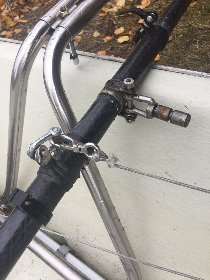 Airot on tietysti hiilikuitua, airo painaa noin 800 grammaa, lapa on kirvesmalli. Tämän jälkeen jos ottaa käteen märän puuairon niin tunne on erikoinen. Hankain on täysin laakeroitu ja täysin säädettävä, airoputken (32 mm) päällä on 35 mm putken pätkät jotka on pyörän satulaklemmarilla kiinni 32 mm putkessa ja niissä siis hankain jne. Hankaimen paikkaa ja kulmaa voi siis säätää. Lisäksi voi säätää polkimelta tulevan vedon paikkaa suhteessa hankaimeen eli kammen pituutta. Luonnollisesti pitkä kampi on tässäkin hyvä.