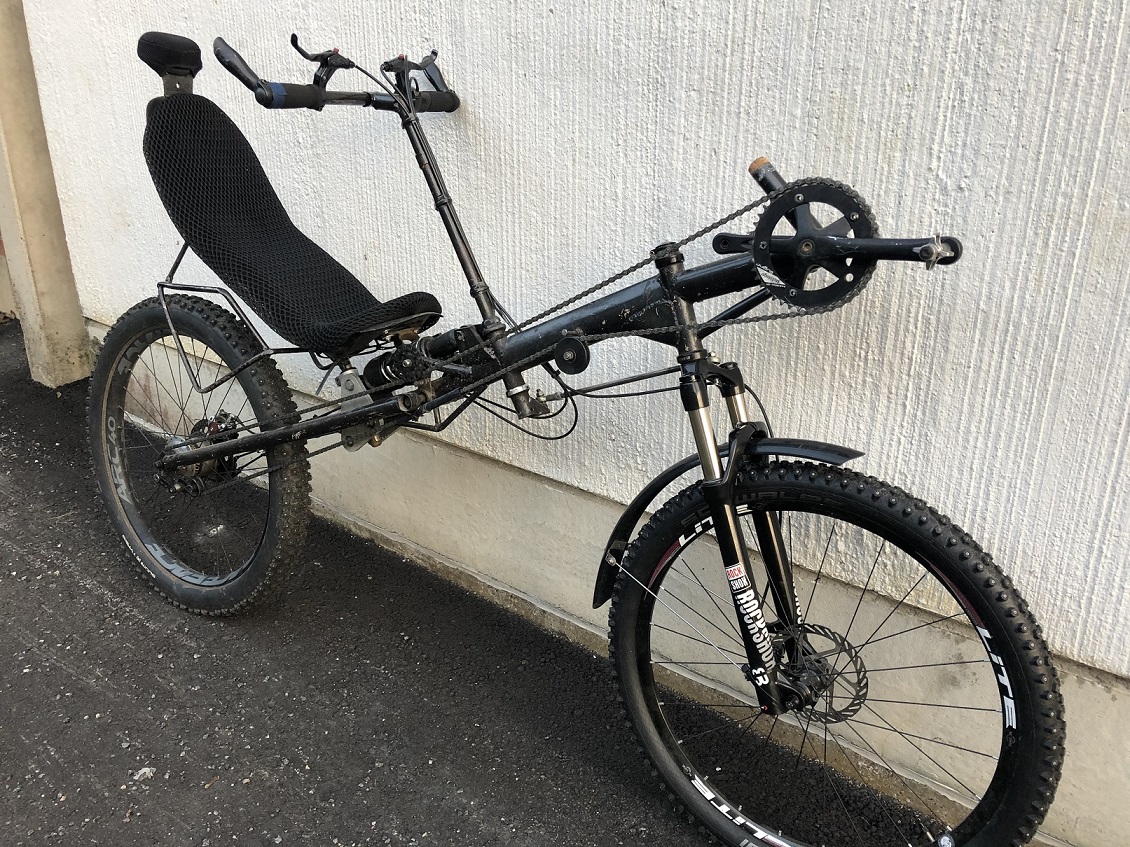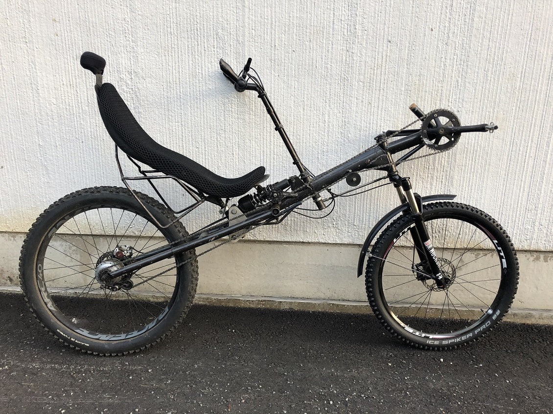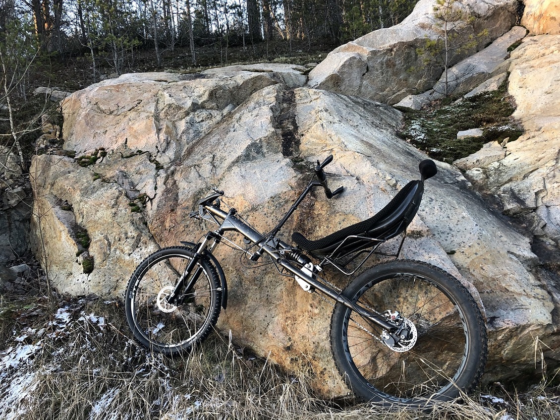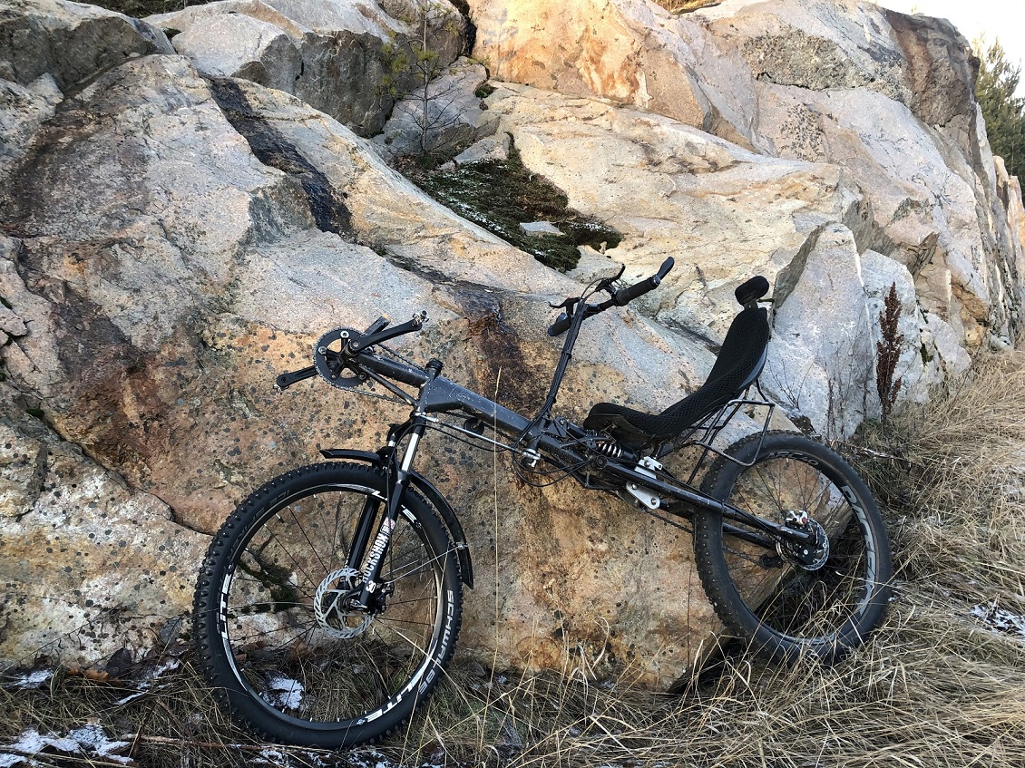 Pyörä on hyvin palvellut muutaman vuoden talvien työmatka-ajossa säätilasta riippumatta. Olen sitä muokannut originaalista, uusi 30mm putkinen vieteri/öljyvaimenettu joustohaarukka, takaiskari mallia iso. Takajouston kolmiopalat teetin alumiinista CNC firmalla. Takana luotettava saksalainen Rohloffi 14-vaihteinen napavaihde ja 27,5' x 3'' nastarengas. Edessä nyt 26'' kiekko, sopii myös 27,5 tai 29 tuumainen. Täydessä ajokunnossa ja kesä/talvi renkaat seuraa mukana.