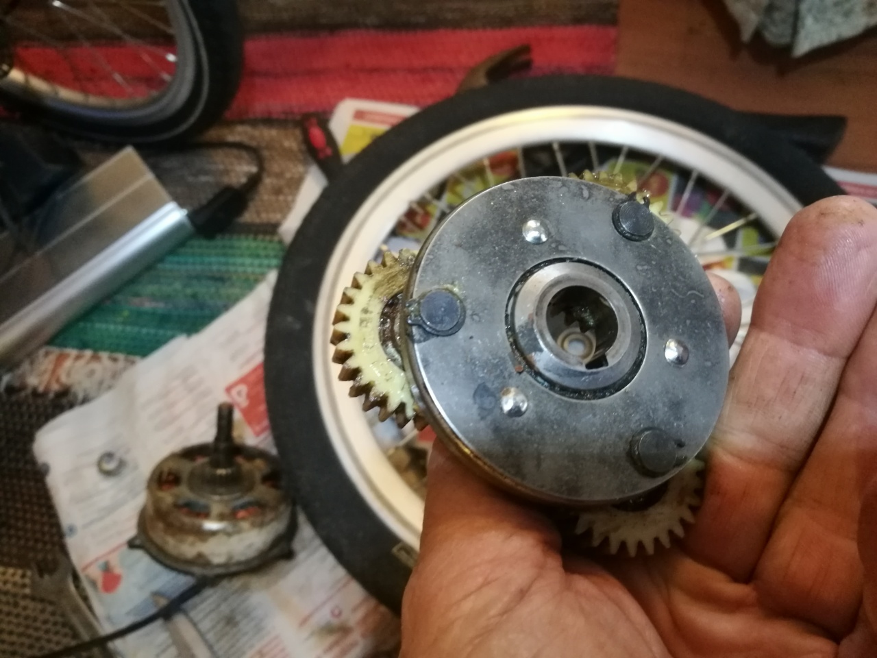 Näyttää siltä, että oli aikakin purkaa tuo. Vaihteiston rattaat kannattaa puhdistaa huolella ja rasvata puhtaalla rasvalla. Moottoria voi käyttää ilman tuota vaihteisto-osaa. Pane akselinpää ruuvipenkkiin kiinni ja kytke sähköihin. JOs saat sen pyörimään, on roottorin ulkopinnan puhdistaminen helpompaa pyörivää roottoria teräsharjalla tai hiomanauhalla jarruttamalla.