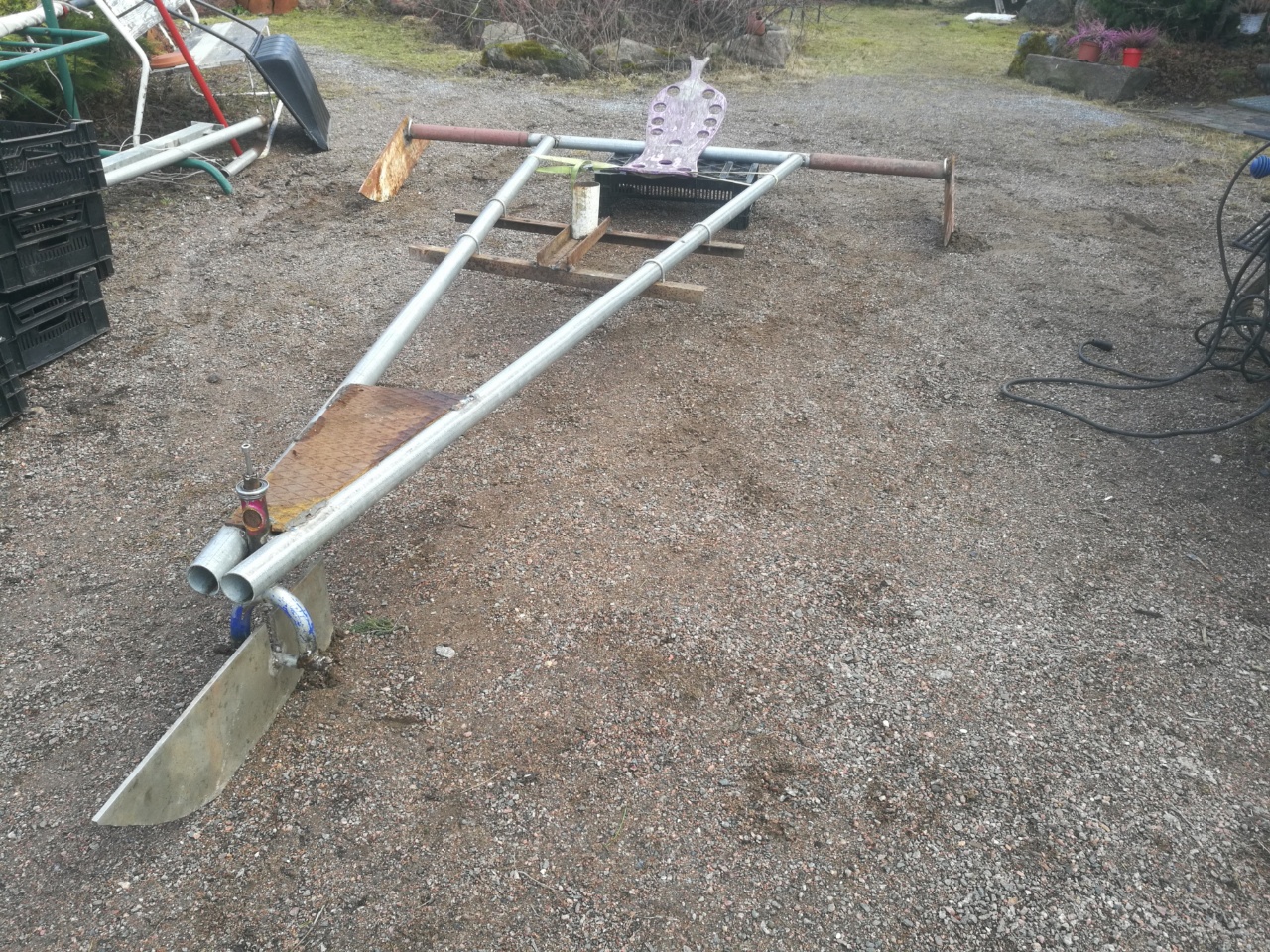 Vaiheessa eli tämmösessä. Maston jalka/putki ei oo viel hitsattu mutta suurin piirtein tohon sen meinasin. Telakalta löyty pienen katamaraanin takila purjeineen, kokeillaan ensin pelkällä isolla jos ei vauhti riitä ni fokka avuks. Masto n. 5,5m korkee ja puomi pari metriä. Puomi ylettää siis kuskin taakse.