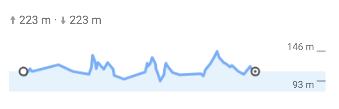 Ylä- ja alamäkiä kertyi 127m ja korkeimman ja matalimman paikan korkeusero oli noin 30 metriä. Lenkin tein sinkuloimalla 3,8 metrin vaihteella ja 152mm kammilla, kadenssi siinä 90 paikkeilla ja näin matkanopeus noin 20km/h.