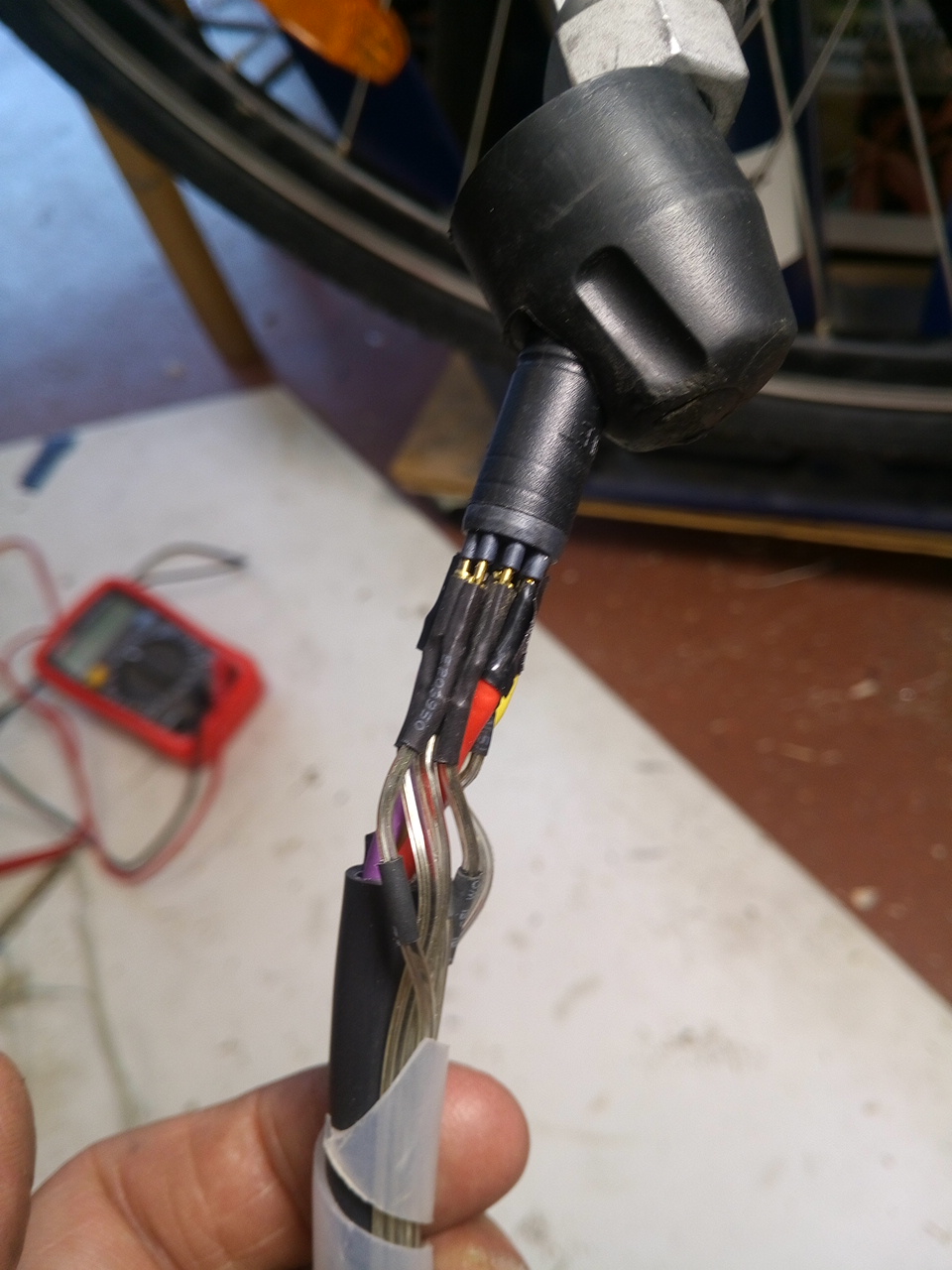 Moottorissa on 9-tappinen julet-liitin. Ekaksi motista kansi auki että näki johtojärjestyksen. Virtapiuhat on juotettu tappeihin, signaalijohdot on dremelillä pitkittäin halkaistuilla abikoliittimillä kiinni.