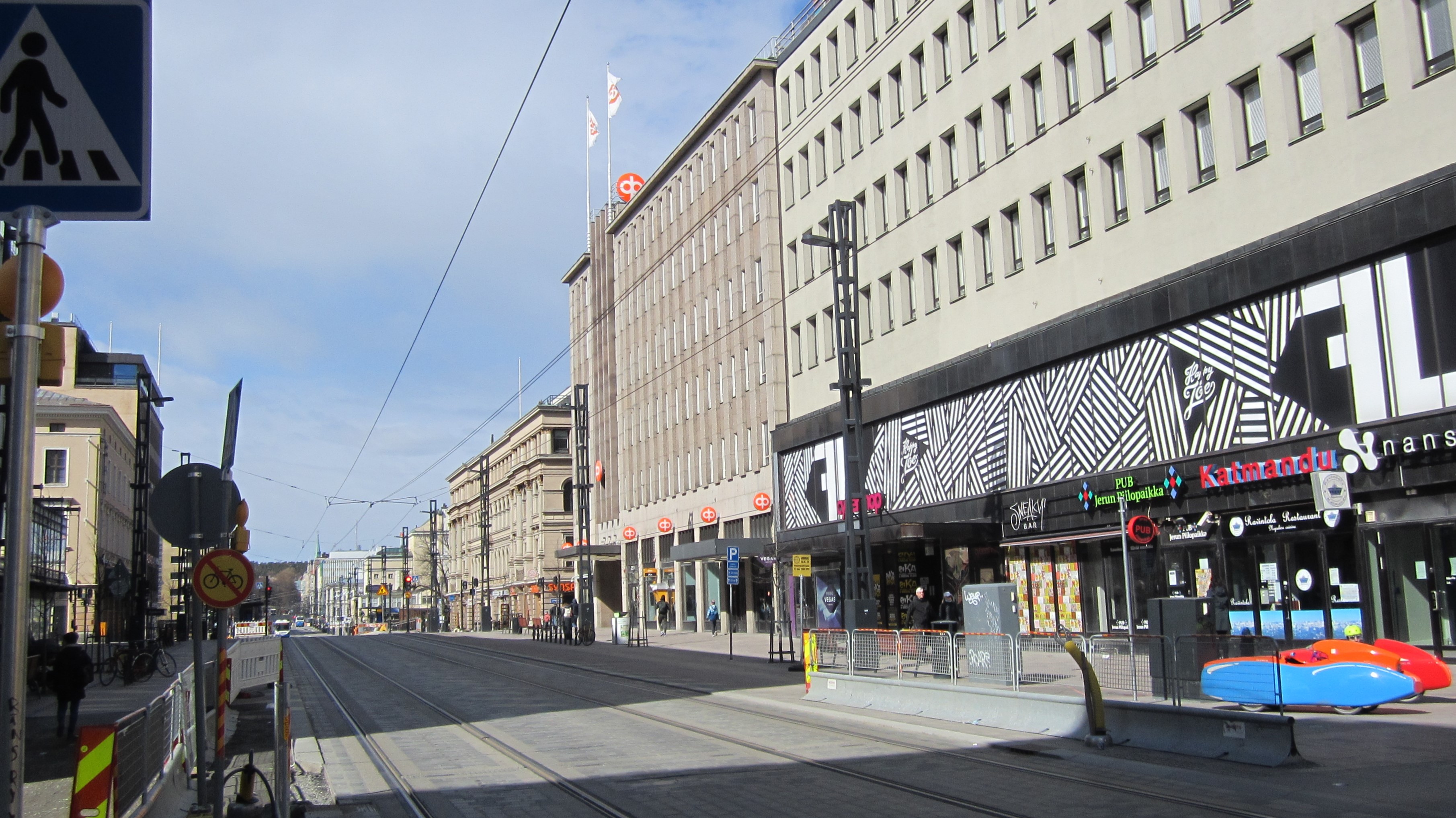Tuossa Hämeenkadulla on kielletty polkupyöräilemästä. Ajaako siinä koko kadulla enää muita kuin ne kaksi raitiovaunua? Saako siinä ajaa edes autolla enää? Miten kinnerillä selviää Hämeenkadun pyöräteillä? Onko hyvä ja tasainen asfaltti? Eiväthän jalankulkijat hypi pyöräteille?