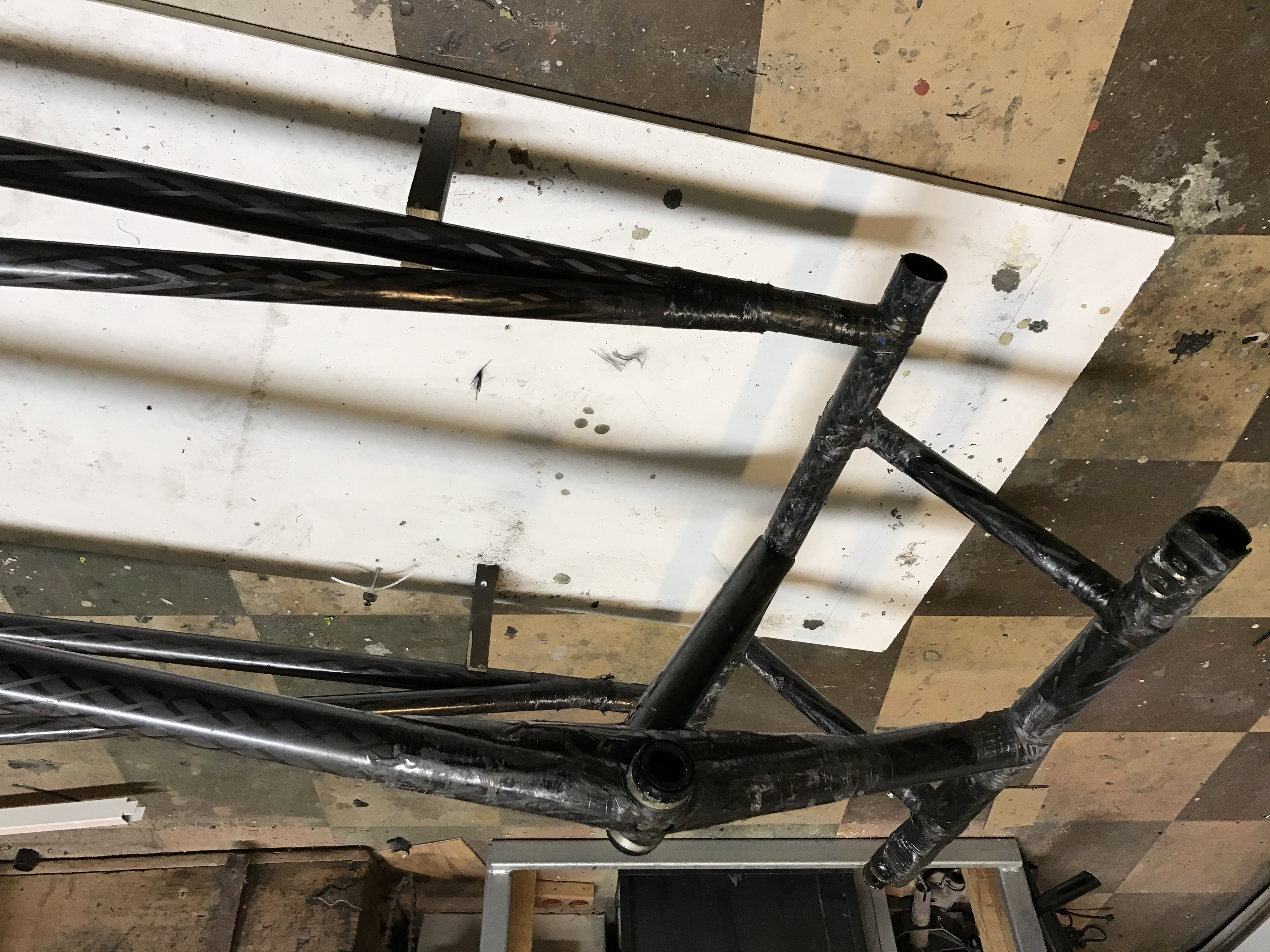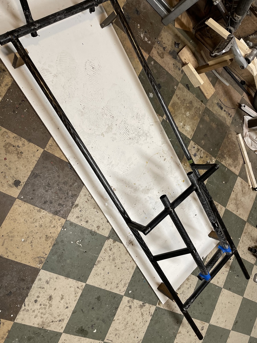 Laitoin kaksi ohuempaa putke rinnakkain ja liimasin ne alustavasti lastulevymuottia vasten. Eli saumakohdan muotoilu ja liimaa sekä pari hiilikuitunauhaa liitoksen yli. Helppo purkaa jos ei osu kohdalleen. Täytyy testailla ja teen uuden jos ei toimi tai jokin ei sovi paikalleen.