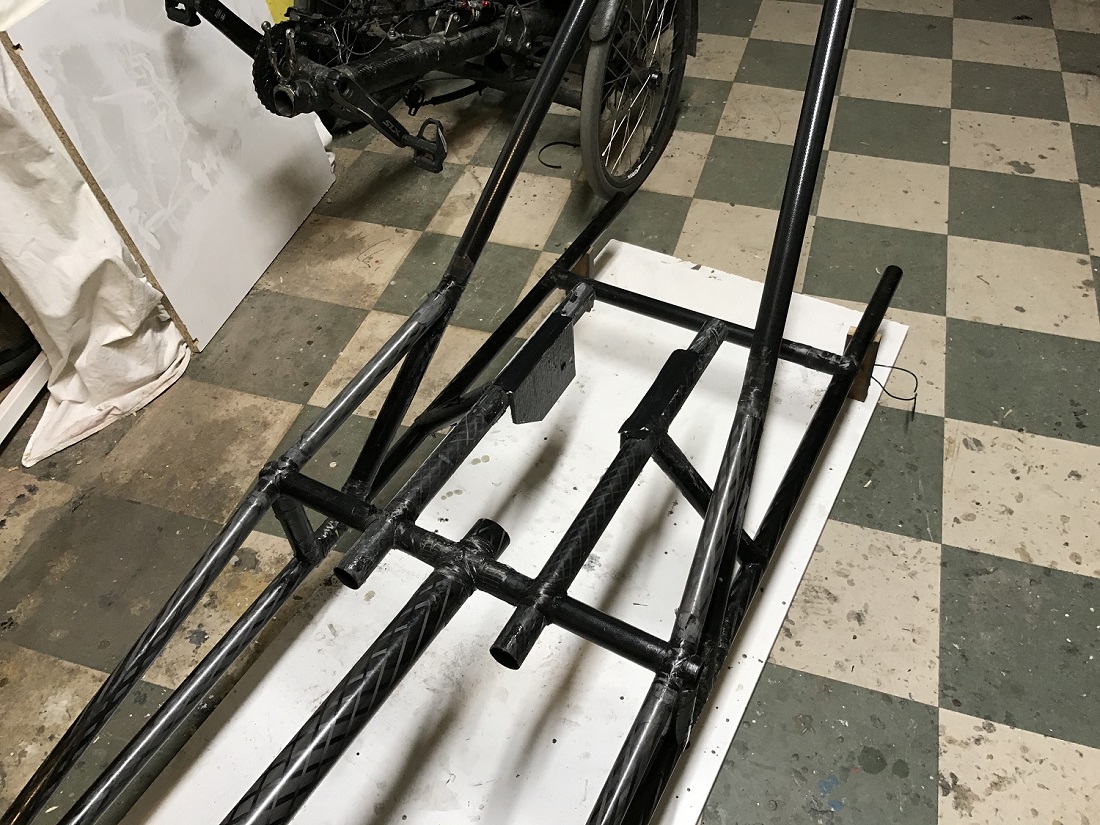 Jorilta oikea huomio, ei mikään. Runko ei ole valmis, keskiön paikkaa vielä mittailen. Keskiö tulee tuetuksi ainakin kolmeen suuntaan, eteen, alas ja taakse ketjuvoimien suuntaan eli keskiöstä vielä putki istuimen alle. Tai jotain mitä sitten keksinkin. Lisäksi ketjuvoimat vääntävät runkoa kun ketju ei ole aivan keskellä, tarvittaisiin vinotukeakin...
