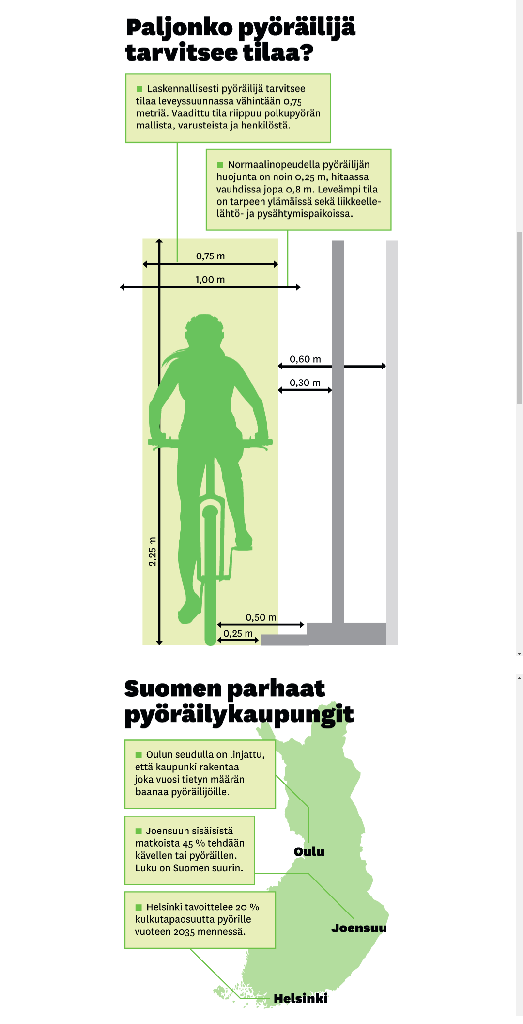 Jos pyörä saa olla 125cm leveä, niin vähintään 150cm täytyy joka paikassa olla leveyttä.