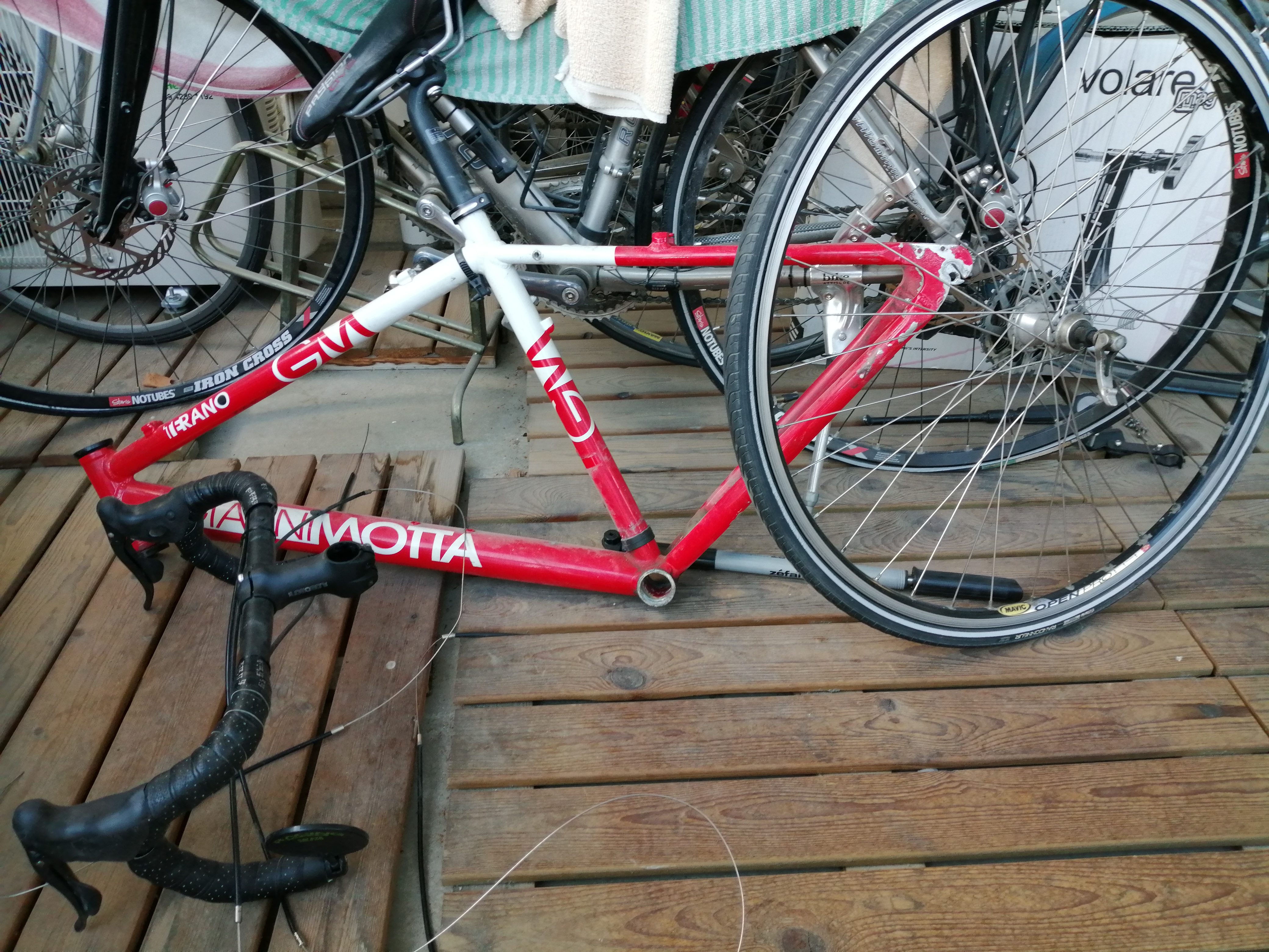 Runko on jotain 46 cm. Osina on Xenon tripla-9 (osat on tallessa), ehjät vaihdekahvat, ohjaustanko 38 cm, takakiekko Xenon napa, jossa Campan 14-28 pakka, on tripla kampi, BB5 keskiö, etu- ja takavaihtajat. Rengas on Vittoria Randonneur, pistosuojattu.