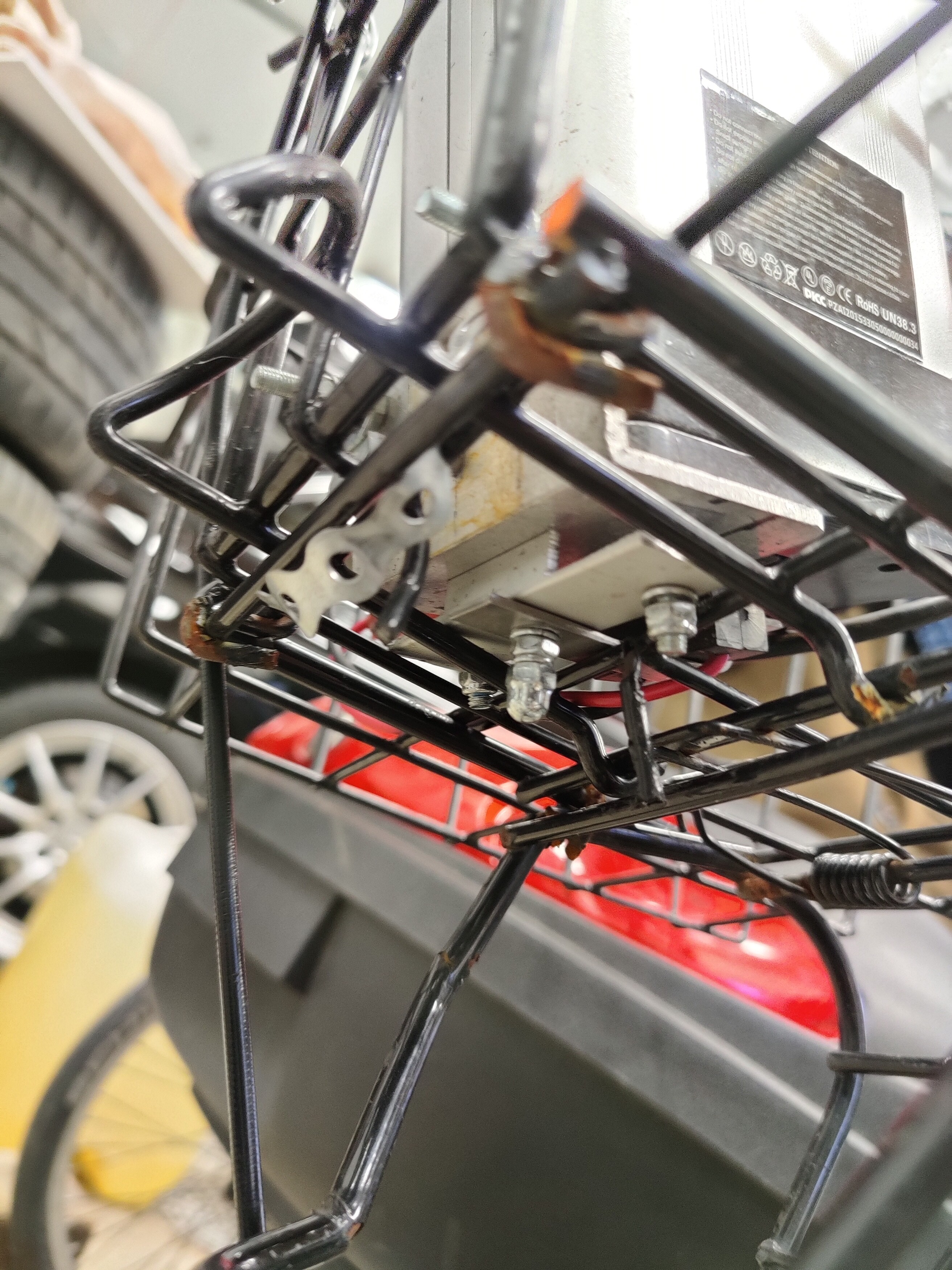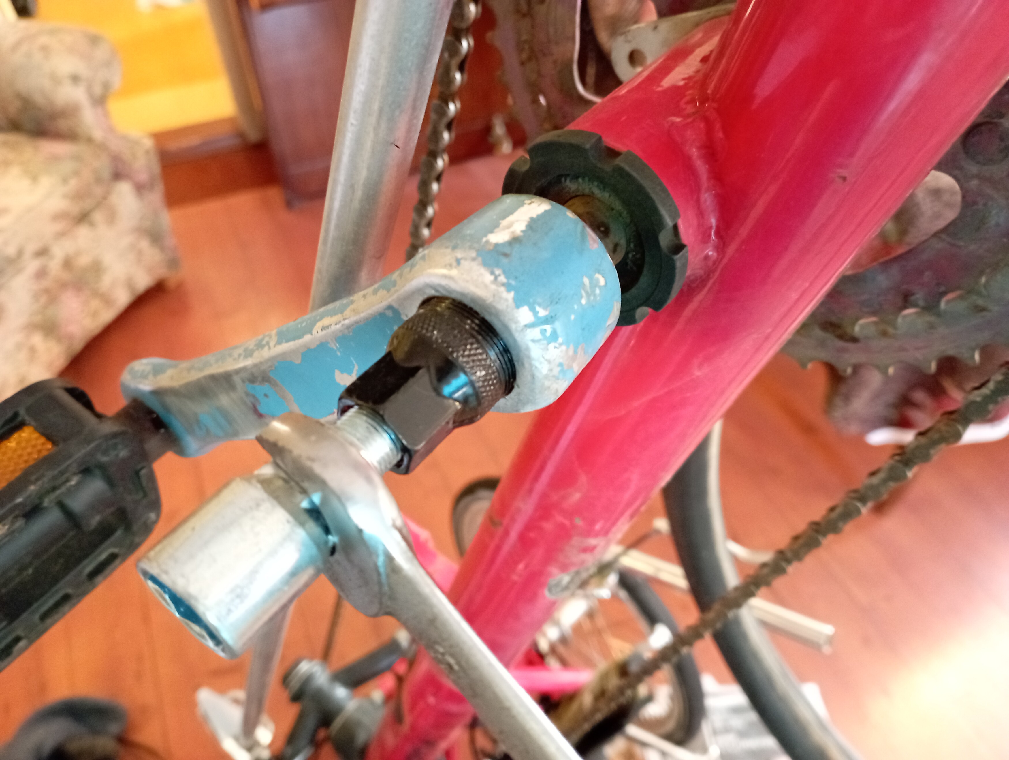 Pyörä kaivettu hangesta, uunin eteen sulamaan. Kiekko pois, rengas kuivumaan ja uuteen kiekkoon. Vasen kampi pois, pyyhkästy liat pois ja poljinanturi (PAS) paikoilleen. Kuuluuko keskiön ja anturin väliin jäädä tuommonen rako ku kuvassa?