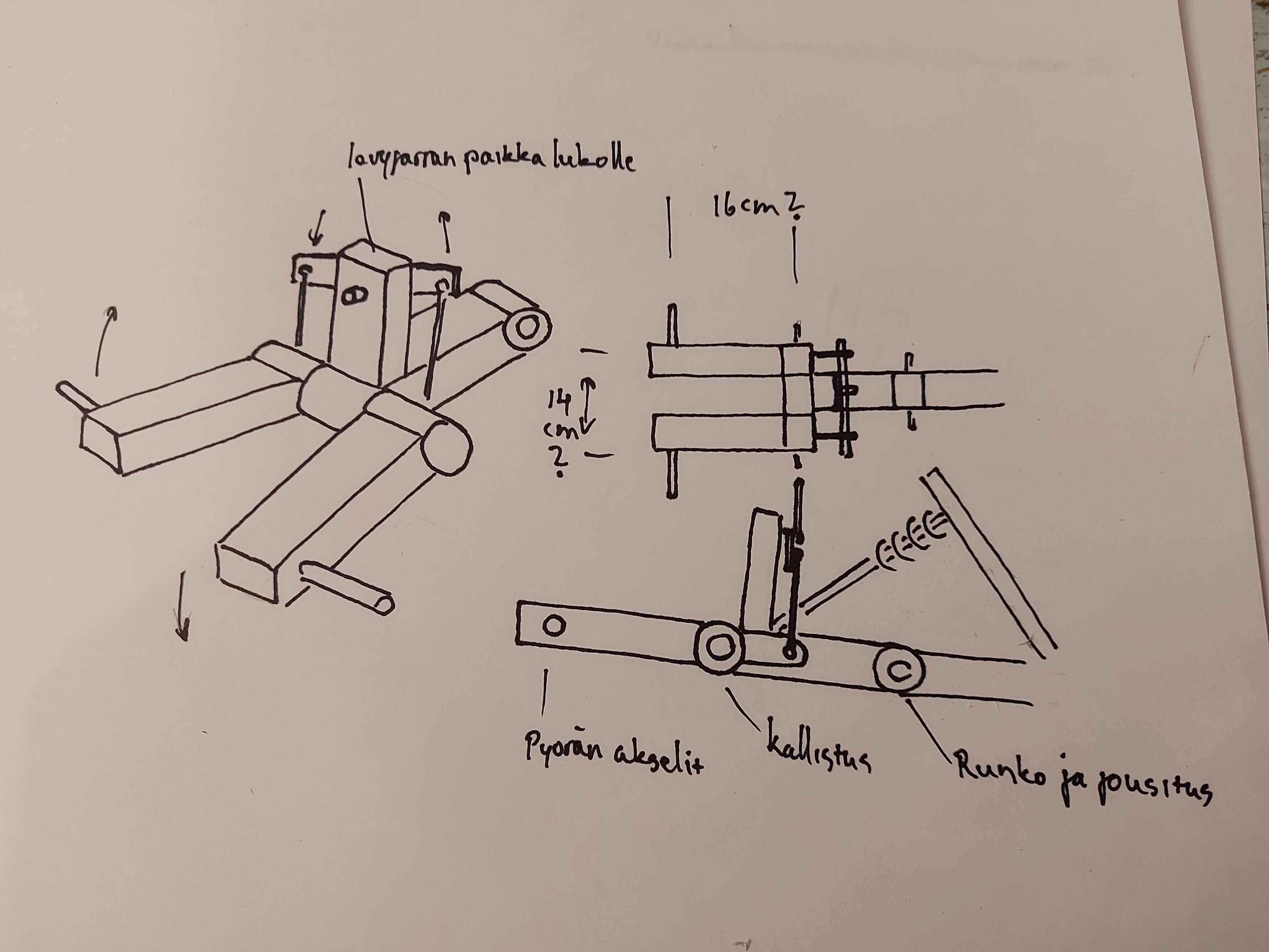 Ja kallistuvassa pyörässä olisi idea että saisin leveyttä pois ja mahdollisesti hiukan lisää vauhtia ja etuvedon idea on yksinkertaistaa rakennetta.