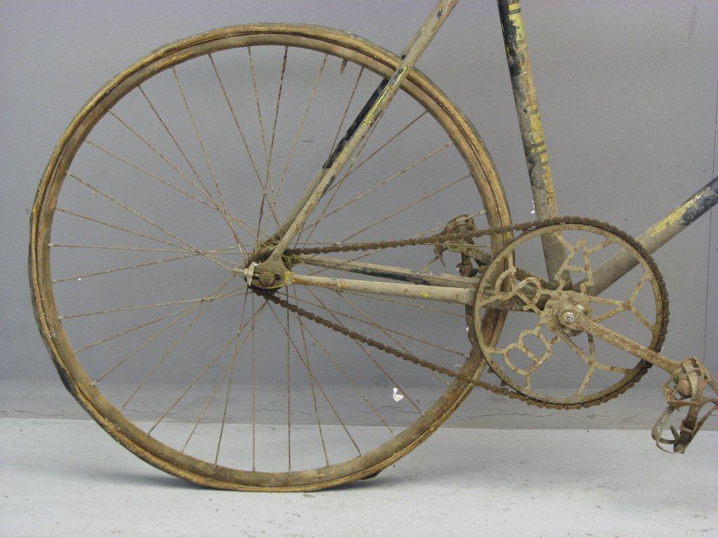 Miten niin, tässä 1920-luvun kilpapyörässä on vain 34-piikkinen eturatas. Eikös tuo ole ihan nykyaikainen rataskoko lyhytkampisissa keskiöissä. Tuossa on vieläpä noin hirmuisen pitkät kammet. ![]()