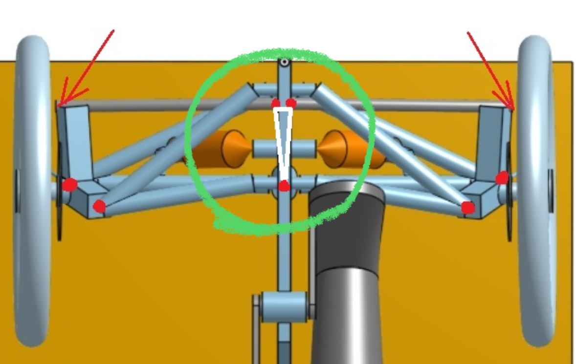 Mikä tässä Ackermanissa menee pieleen? Raidetankojen ulompien päiden sijainti on mielestäni oikein, mutta silti sisempi rengas kääntyy jopa vähemmän kuin ulompi. Raidetanko on liian pitkä sen puoleen, että töyssyyn ajaminen kääntää ohjausta, mutta saisi nyt edes Ackermanin toimimaan. Nuolet merkkaavat raidetankojen ulompia päitä ja punaiset pallot sisempiä ja olka-akselin niveliä. Keinuvipu valkoisella raidetankojen välissä.
