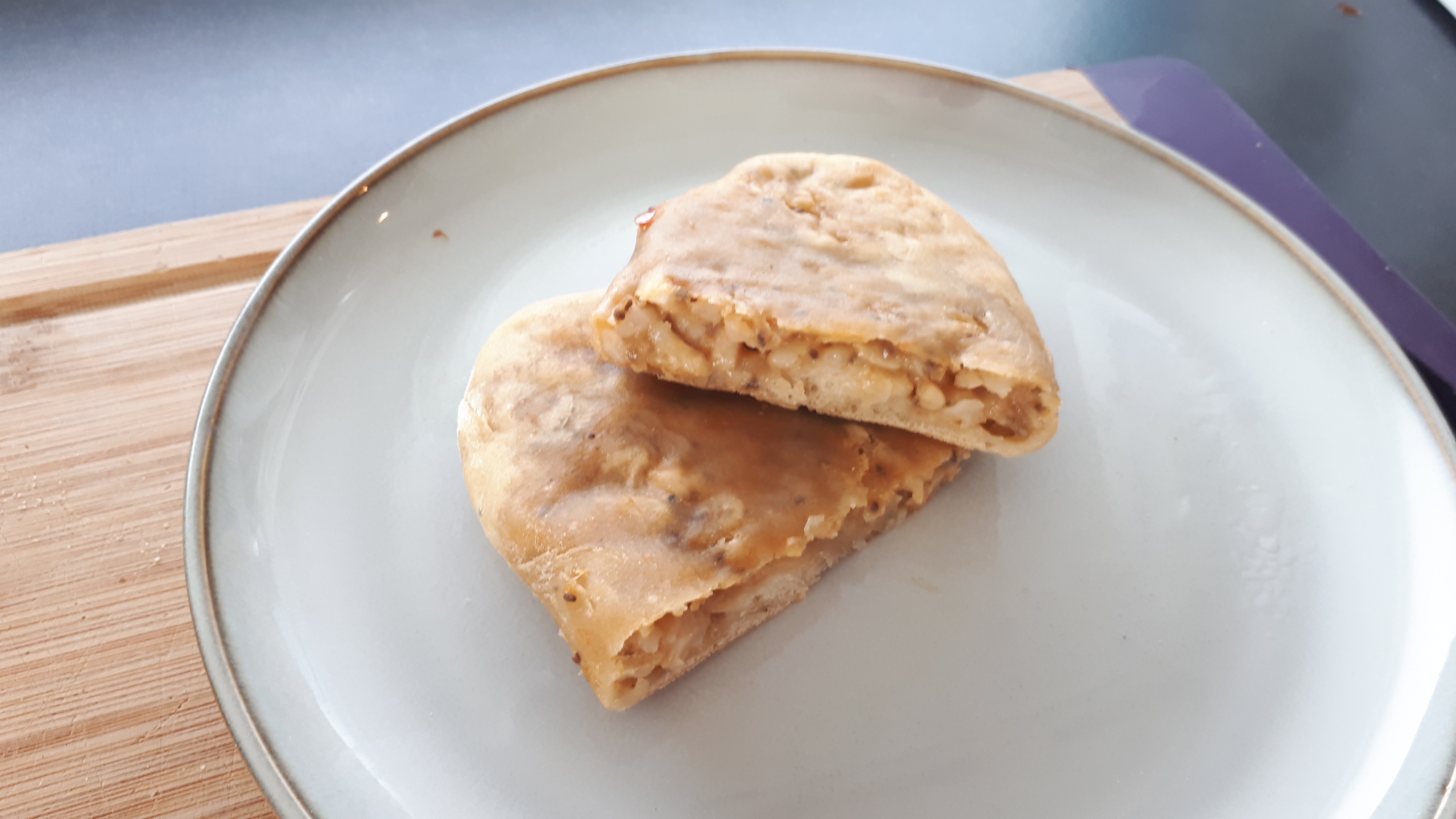 Taikinaa on täytteeseen nähden puolet liikaa, mutta pienempää taikinaa on vaikea tehdä. Loput mitä jää yli, voi pakastaa tai leipoa vaikka sämpylöiksi.
