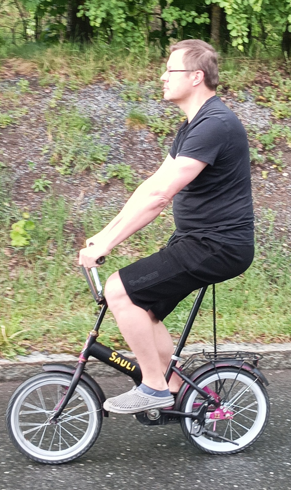 Sauli on ollut lomalla joten muut ovat ajelleet pyörällä hallissa autojen välissä. Keulimiskilpailun johdosta satulaputki taittui, joten toin pyörän kotiin ja lisäsin tukitangon.