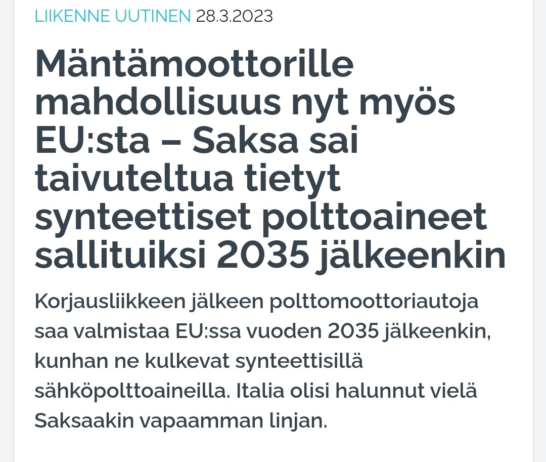 Oon tätä uutista odottanutkin. Kategorinen mäntämoottorikielto kun ei ole viisasta, ainakaan tällä aikataululla. Akkuteknologia on vielä niin lapsenkengissä.