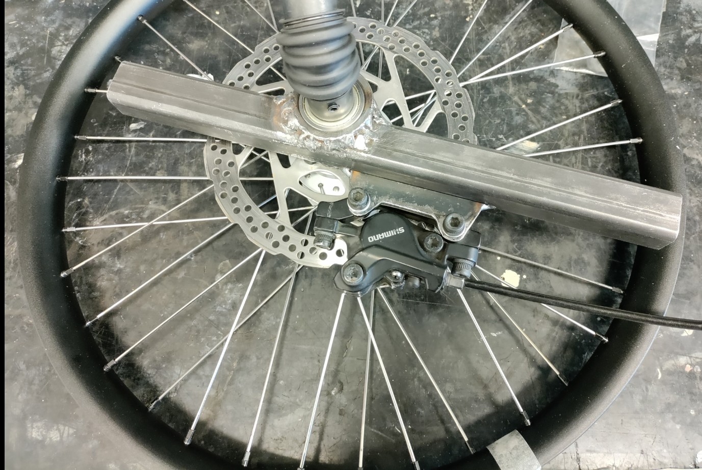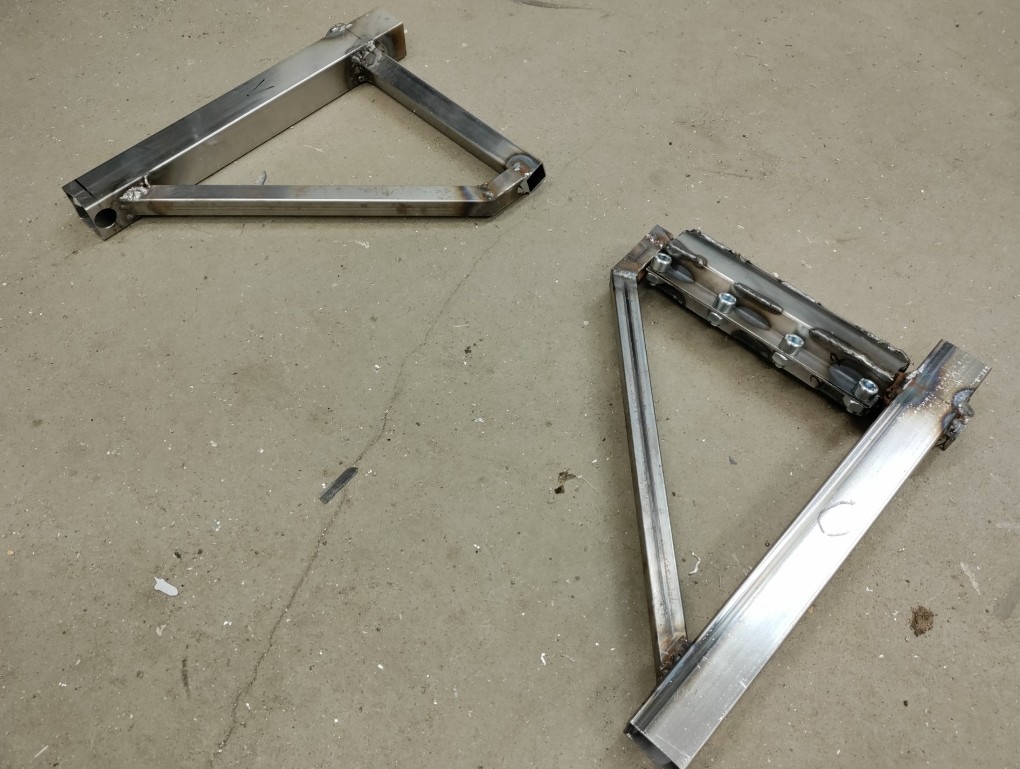 Heilurivarsi, jousituksen sisäputken ulkopäässä on laakeripesä, johon väliakselin ulompi laakeri menee. Vahvistan heilurivartta vielä kolmiorakenteella. Silloin hukataan kyllä tavaratilaa, mutta muuten tuonne liitokseen tulee aika kovia voimia.