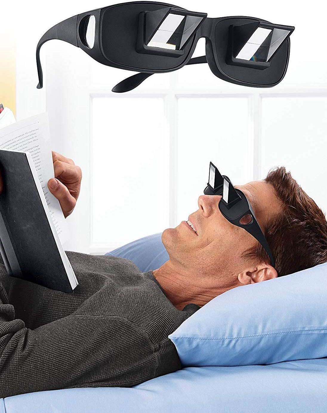 Jos ajaisi tällaiset prisma-lukulasit päässä, voisi olla aivan makuullaan eikä kävisi niskaan. Näihin yhdistettynä periskooppi niin näkisi hyvin polvien ja katteen yli. Ihan vaan ideoita. Ei välttämättä käytännöllisiä ![]()