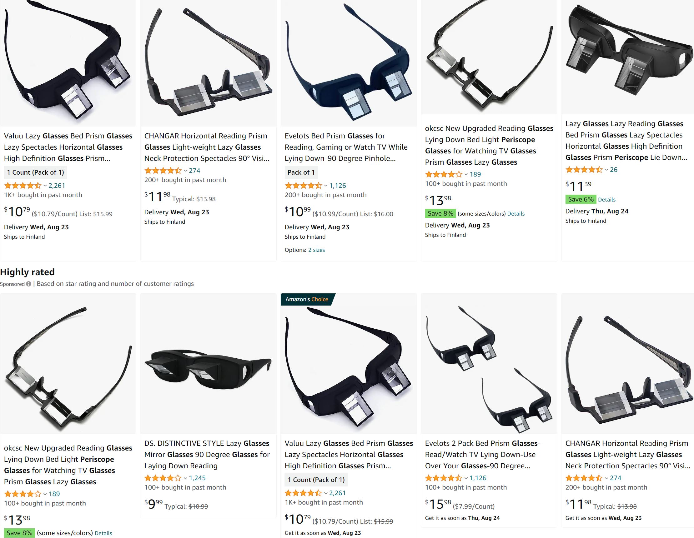 En osaa saatavuudesta sanoa enempää kuin että esim Aliexpressistä näyttää saavan. "Lazy glasses" nimellä löytyy myös. Joskus kokeilin toisin päin eli pään suuntaan näyttäviä laseja, tarkoitettu säästämään niskaa jos pitää pitkän aikaa katsoa ylöspäin. Muistaakseni ne päässä pysyi seisten pystyssä ja käveleminenkin taisi onnistua.