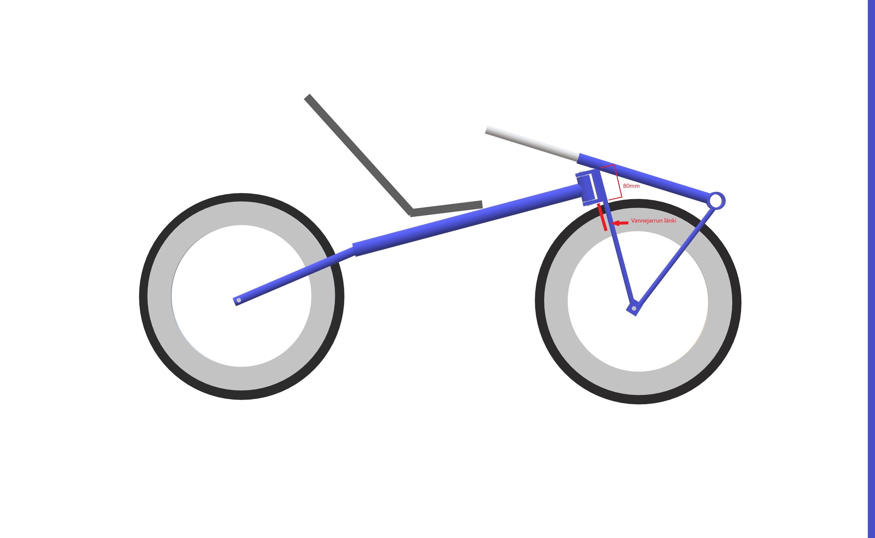 Ei kestä takahaarukka tuossa kohden. Tuo ohjausnivel tekee aikaloisen momentin noihin pystyputkiin, varsinkin jarrutustilanteissa. Nivelen kohdalla olisi pystyputkien syytä olla.. Hmm.. Ehken 25mm halkaisijaista putkea kunnon seinämällä, tai muuten ne nitkahtaa ensimmäisessä jarrutuksessa. Tukeva maasto,-tms pyörän haarukka on riittävän vahva tuolta kohden. Lisäksi näissä pyörissä helpottaa elämää kummasti jos laittaa levy,-, tai rumpujarrun. Se antaa jaloille tilaa liikkua eturenkaan sivuilla ilman että jarrulänget hälppii sisäreisiin.