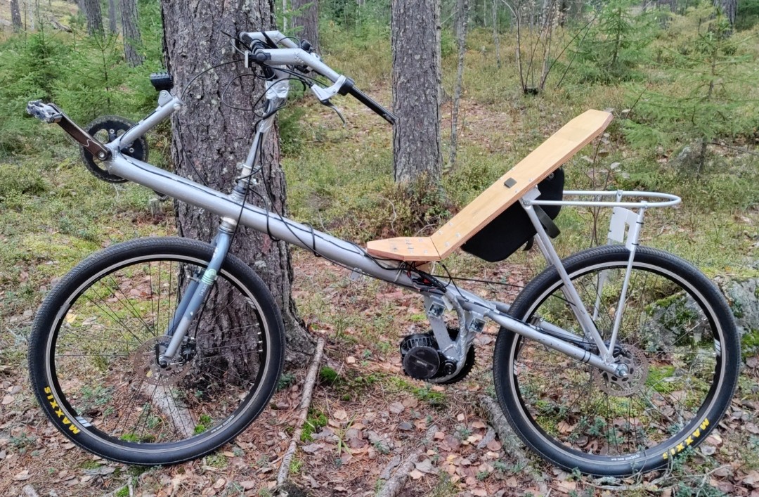 Tämä pyörä sai sähköt. Penkin alla on erillinen poljinkeskiöputki, johon moottori kiinnittyy. Olisihan tuohon penkin alle sopinut napamoottori, ehkä paremminkin, mutta poljinkeskiömoottori löytyi valmiiksi niin sillä mentiin.