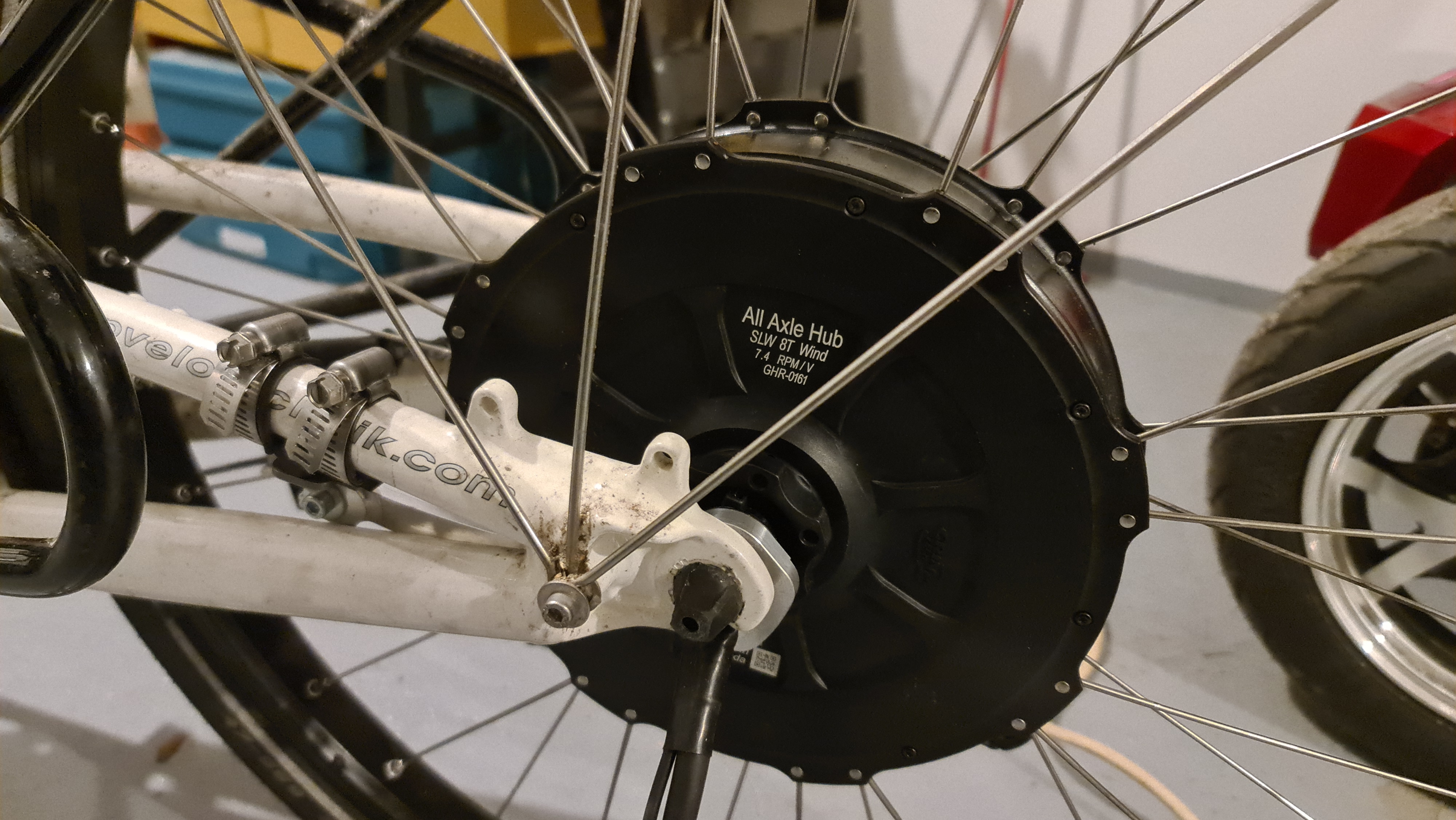 Velotechnik Scorpion FS26 sähköistys tässä aluillaan. Grin All-Axle moottori meni heittämällä paikoilleen haarukkaan, ei tarvinnut viilailla. Moottori on suunniteltu sopivaksi 135 mm pikalinkkuun ja 12 mm läpiakseliin sopivaksi, tarvitsee vain ao. sovitusrenkaat molemmin puolin akselia. Vapaakytkimessä on sisäänrakennettu poljinsensori, joten regenin saa toimimaan polkemalla taaksepäin polkimista. Erillisiä poljinantureita ja regen-kytkimiä ei siis tarvita. Painaa vain 4 kg.