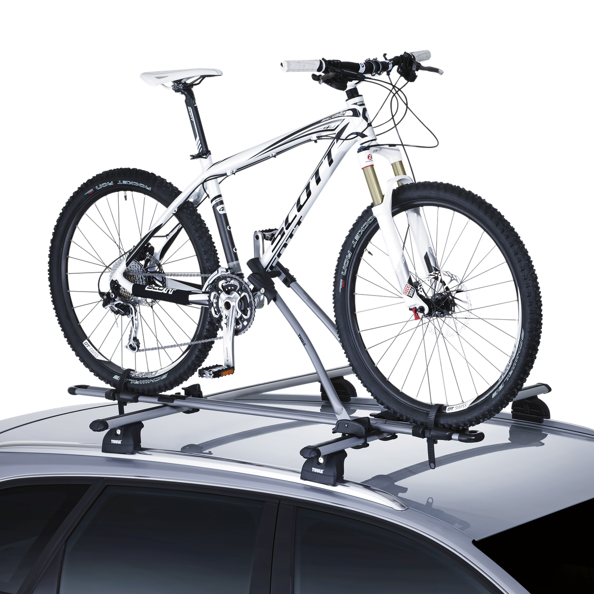 Mulla on tämä Thulen teline mihin pyörä kiinnitetään etuhaarukasta: https://www.thule.com/fi-fi/bike-rack/r ... e-_-564001