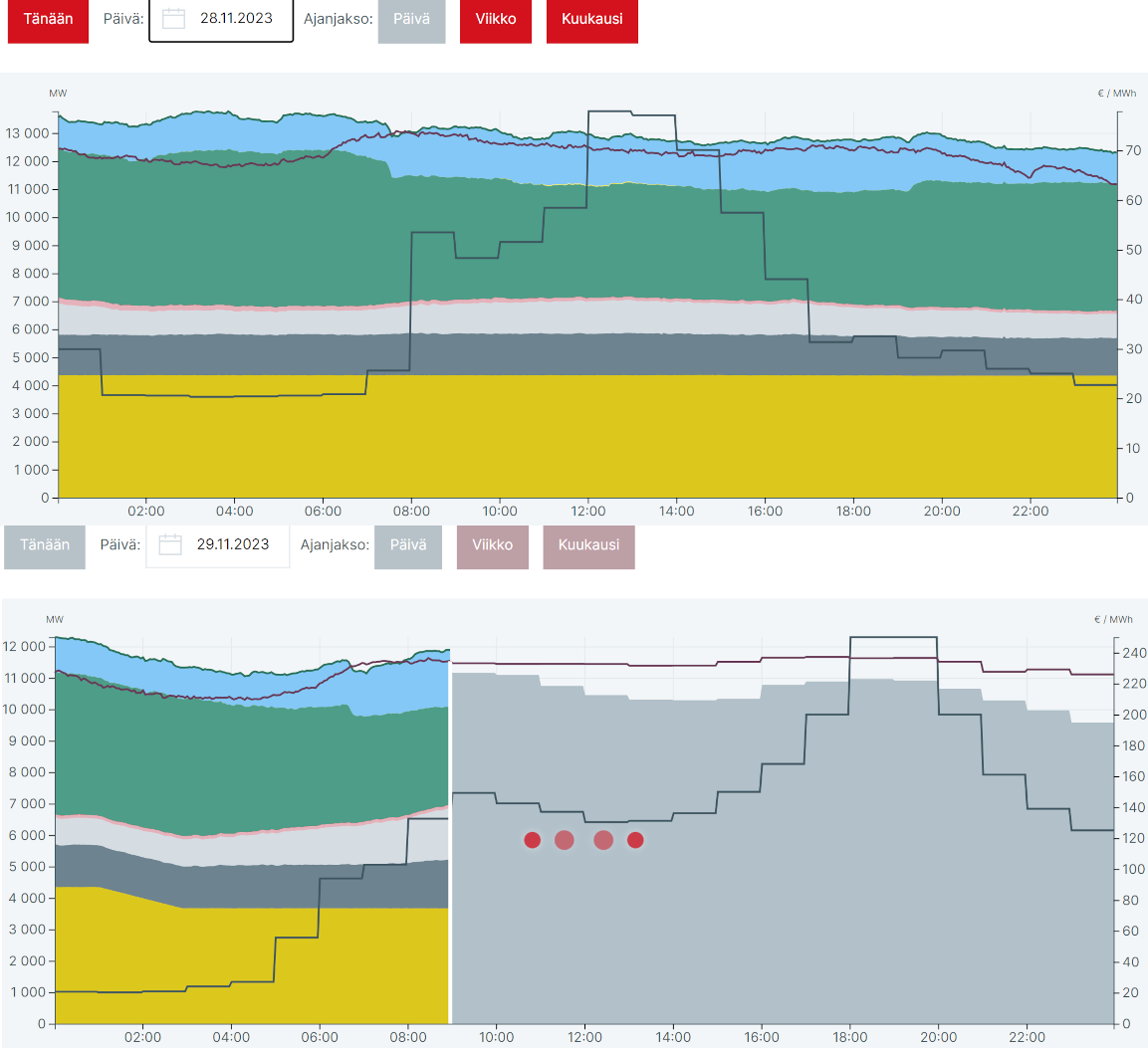 Eilen (kuvan ylempi osa) tuulivoimaa ajettiin alas viitisensataa megawattia siksi ajaksi kun sähkön hinta oli korkeammalla ja nostettiin taas takaisin, kun hinta halpeni. Tänään tehtiin sama alasajo tuulivoimaan, mutta myös Olkikolmonen käännettiin puolivaloille, eli 800 MW pienennettiin kaasua. (kuvan alempi osa). Mitä ihmettä täällä tapahtuu. TVO ei ole ainakaan toistaiseksi tiedottanut syytä, eikä tuulivoimayhtiöistäkään kuulu mitään. Nyt olisi journalismin paikka, jos sellaisia vielä jossain olisi. :roll: