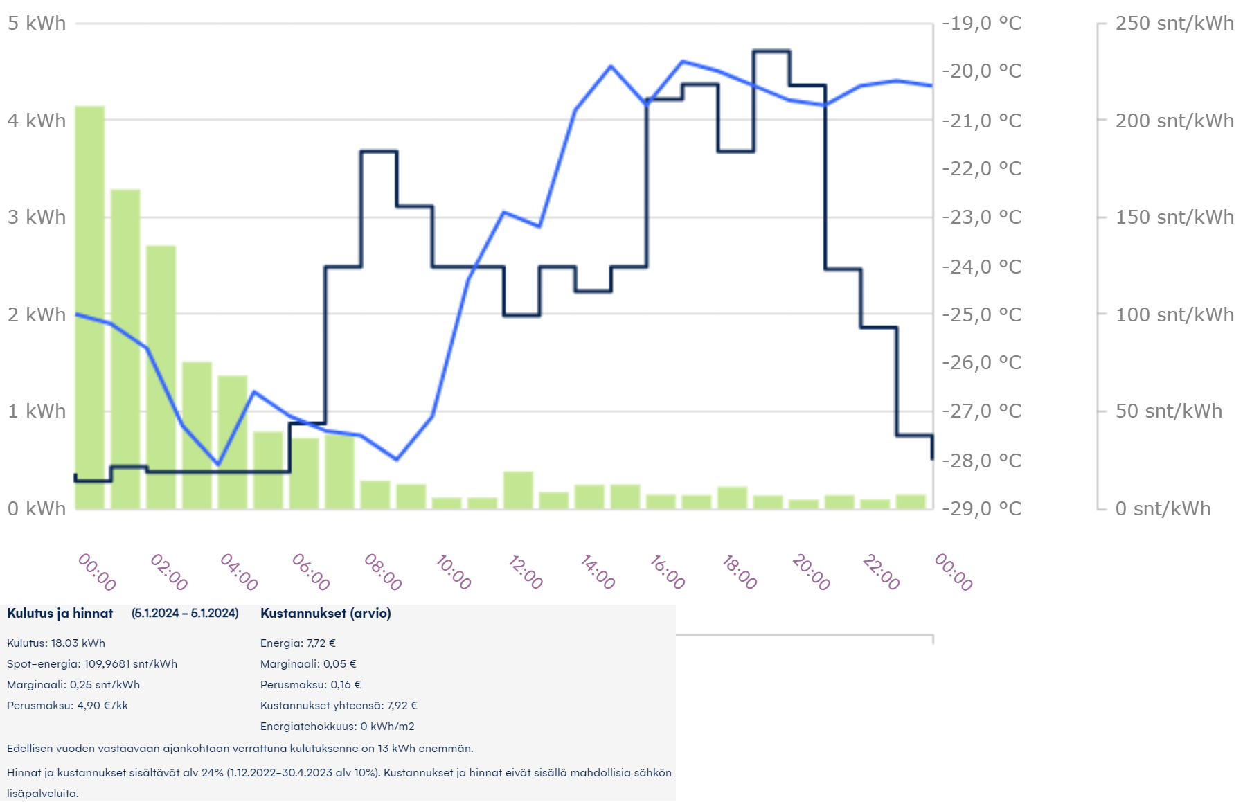 PW kirjoitti:Eilen sain sähkön kulutusta tiputettua lähes puoleen edellisestä päivästä ja ne hurjimmat 2€:n tunnit mentiin reilusti alle 1kwh kulutuksella. Kaasulämmitin oli kolmisen tuntii päällä.