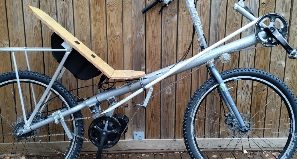 Jousitusta kaipaisin talvipyörään, tällaiseen SWB-malliin taakse ja myös eteen. Sen pitäisi kyllä olla kumijousitus tms. huoltovapaa viritys. Taakse helppo toteuttaa, mutta eteen pitäisi kai tehdä jokin linkusto teleskooppihaarukan sijaan, jos kumilla meinaisi jousittaa. Tähän tyyliin: