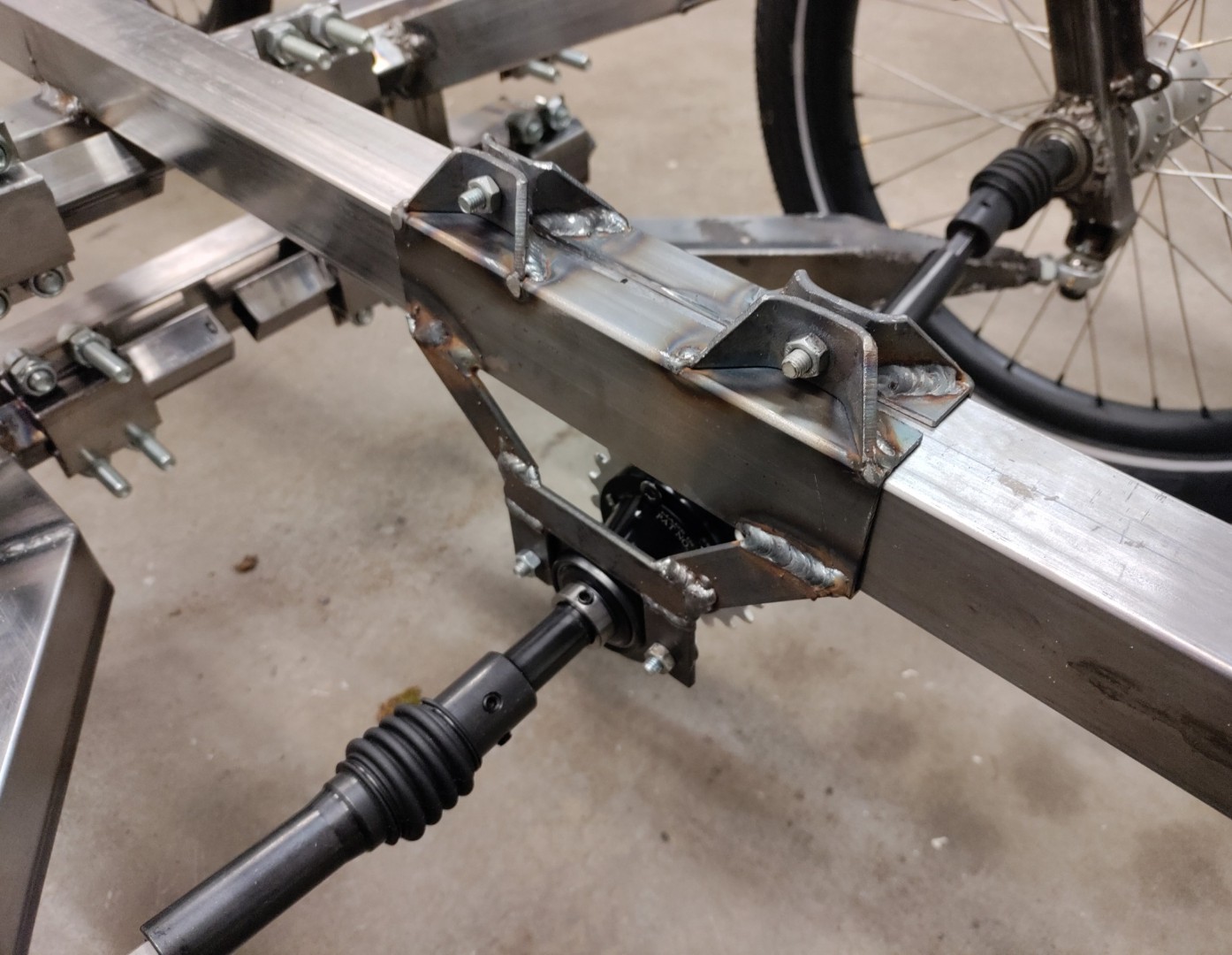 Paljon menee aikaa räpeltäessä pieniä osia, jotka eivät tunnu edistävän kokonaisuutta. Tässä etutasauspyörästön kiinnitys runkoon. 45x45x2-putkesta saa kätevästi klemmareita 40x40-putken päälle.