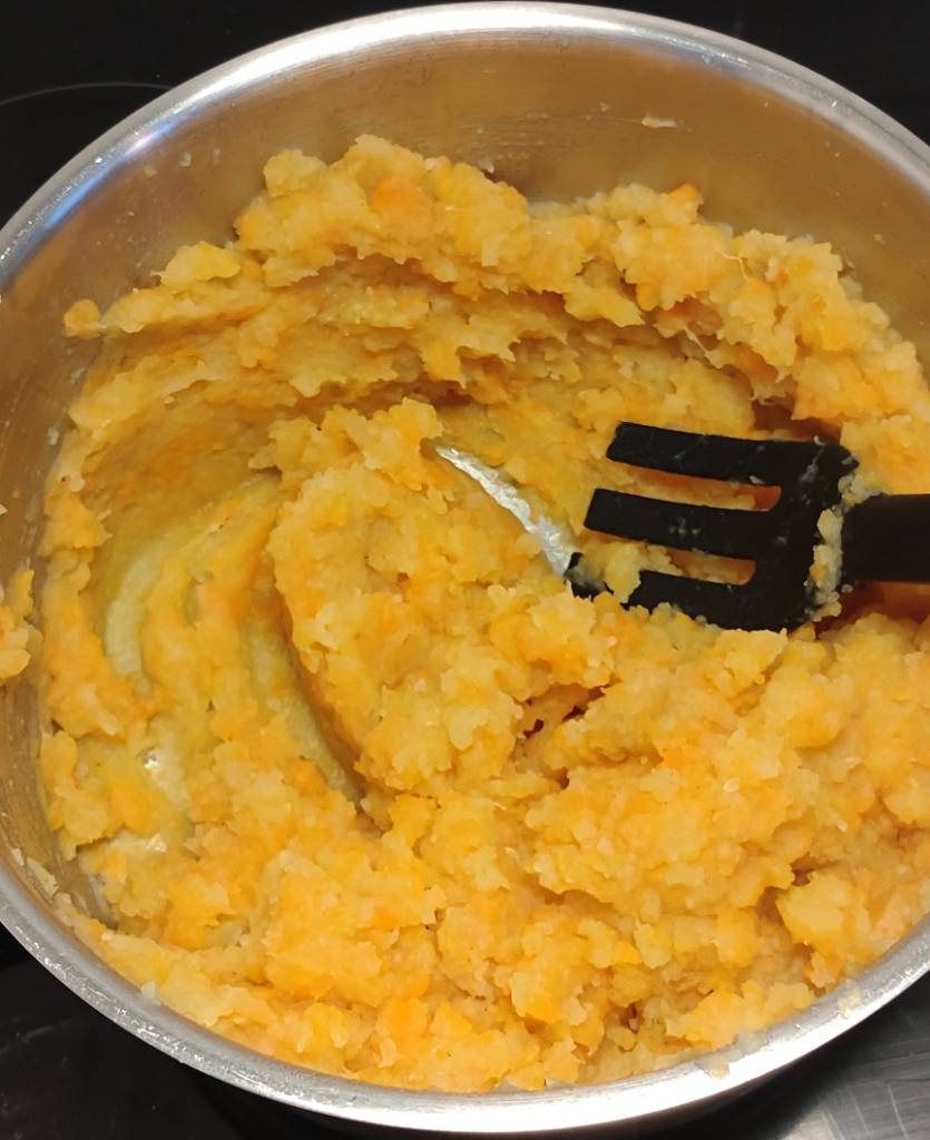 Peruna porkkana (puolet perunan määrästä) kesäkurpitsa (eilisestä jäänyt nysä) muusi. Korkeapaineella 10min + kuoriminen ja halkaisu. Nesteenä höyrytysvesi. Yrttistä mineraalisuolaa ja avokaadoöljyä.