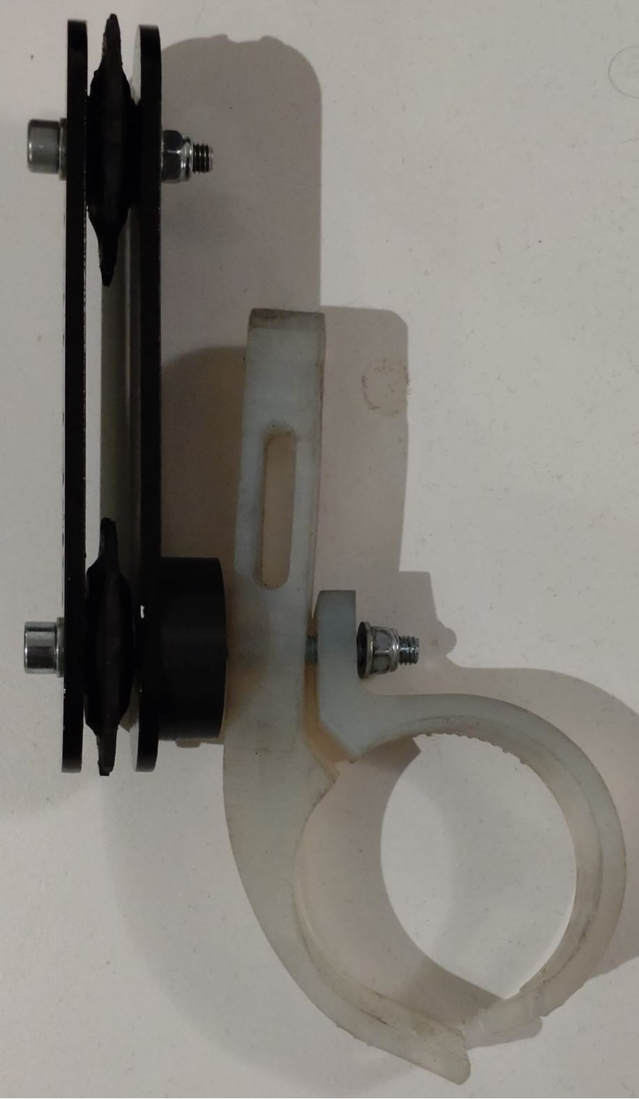 En huomannut kenenkään ehdottaneen pujotettavaa klemmaria. Tuo minun ehdotukseni oli ruuvilaipan korvaaminen putkimaisella osalla, joka kiinnittyy pantaan pidemmältä matkalta kuin laippa. Ehdotan siis tätä pannan kiinnitystapaa.