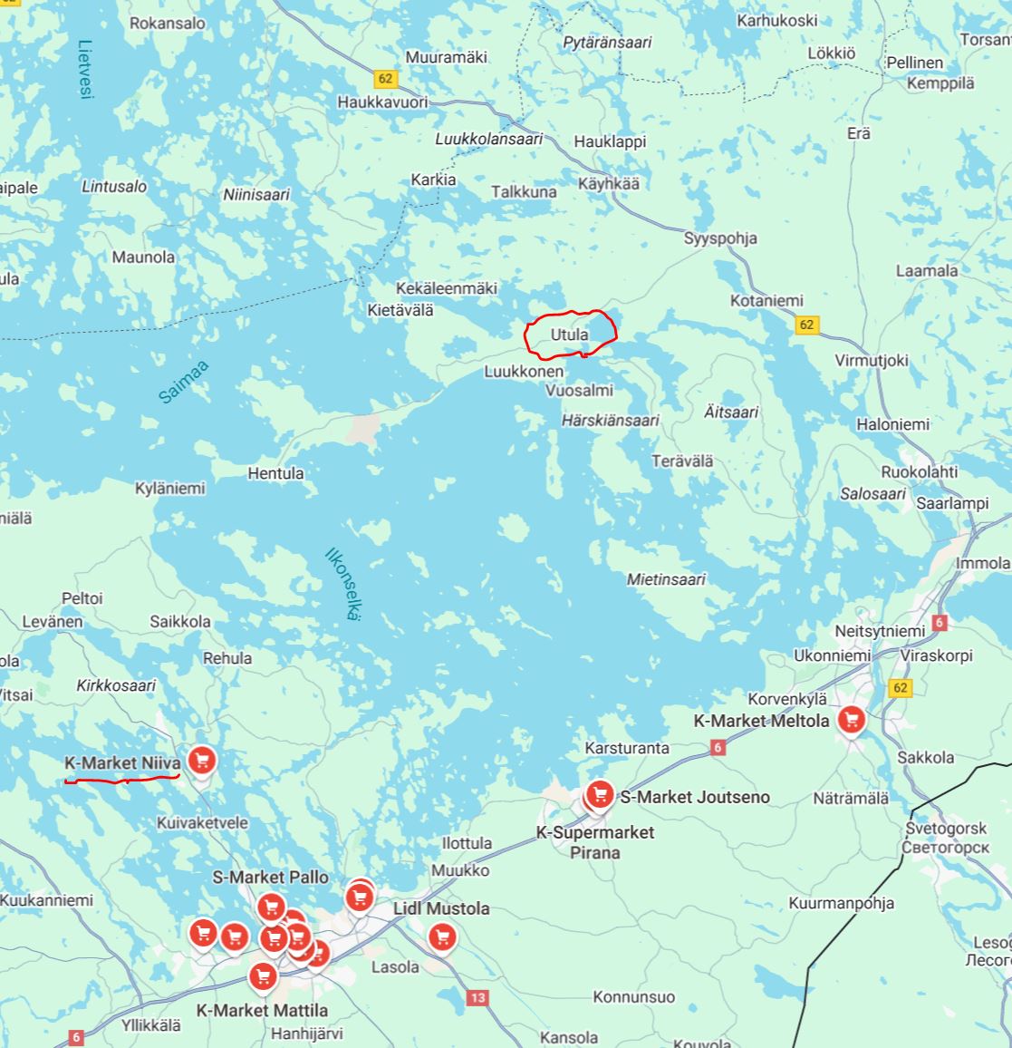 Näemmä (Googlen mukaan) kaupat ja ravintolat loistavat poissaolollaan Lappeenrannan jälkeen. Taitaa joutua ostamaan aamupalatarvikkeet jo K-market Niivasta. Jos on kuljetuskapasiteettia käytössä, voidaan harkita myös maantielounasta, jonka voin valmistaa. 1600 ml titaanikattila ja kaasukeitin löytyvät, joten esim. kuivalihasta ja perunamuussijauheesta ainakin jonkinlainen Ala Garmee lounas onnistuu.