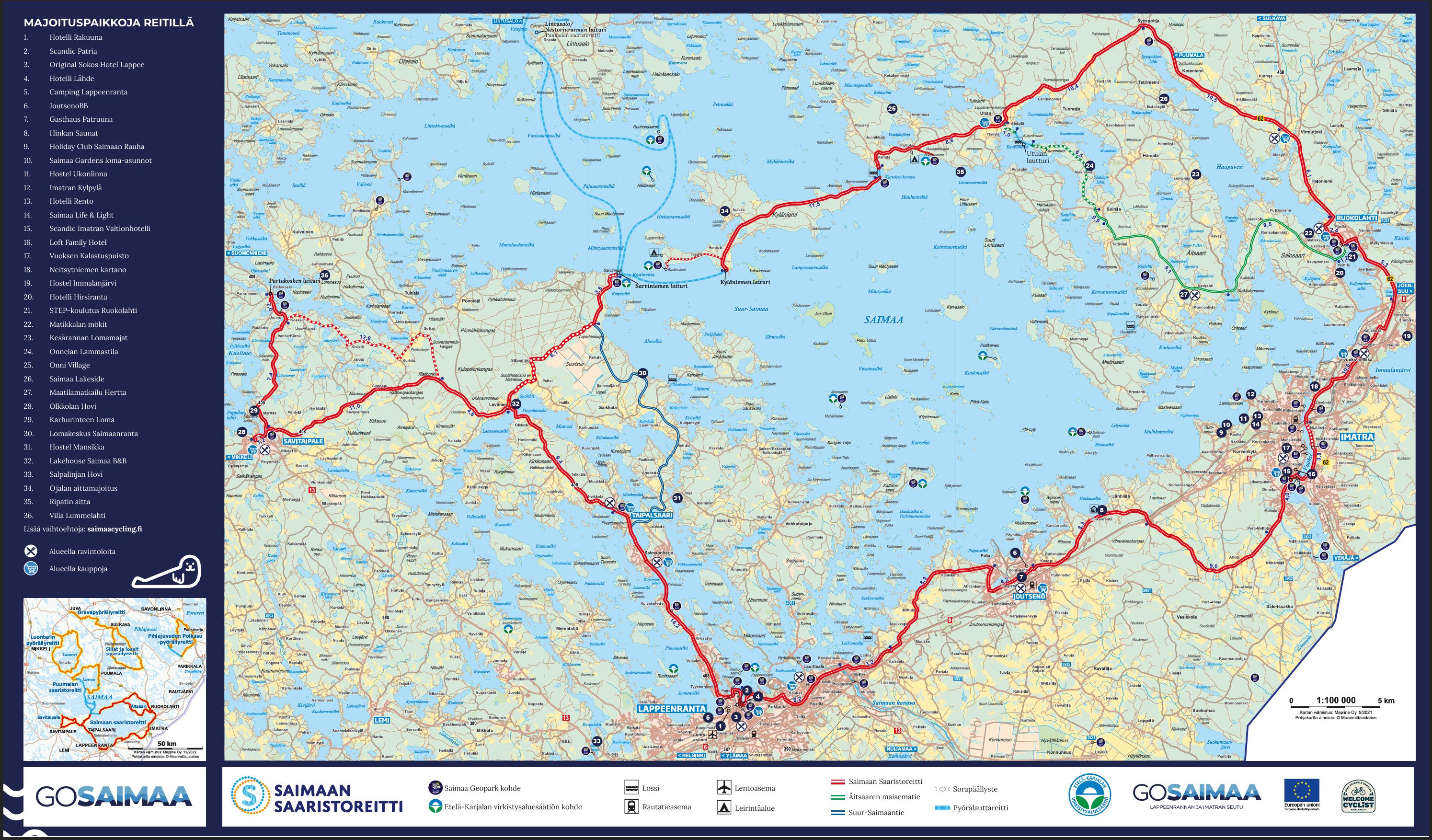 Toisena päivänä Lappeenrannasta Sarviniemen laiturille. Hyvin olisi aikaa, kun pitää olla siellä 15:45 lähtevään kyytiin. Ajomatkaa noin 36 kilometriä. Laivamatka kestää noin 30 min, jonka jälkeen 20 km säteellä olisi parikin yöpymispaikkaa.