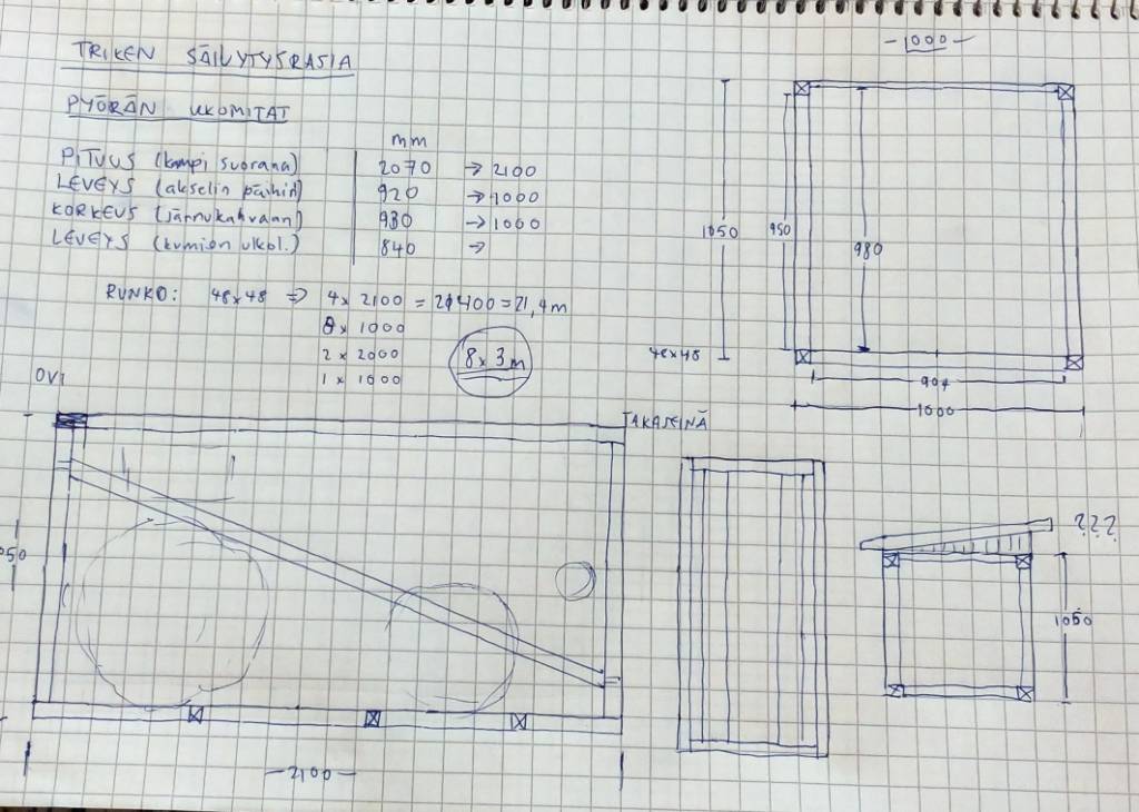 Kävin mittailemassa pyörää, mutta tämä tuntuu päättömältä ja kalliiltakin ajatukselta. Kuvasta puuttuu 19x95 mm julkisivupaneli, jota menisi kymmeniä metrejä. Eikä laskelmassa ole vielä kattoa, pohjalevyä, perustuksia, maaleja yms. Katettuna pyörä ei mahdu tuonne ja pidempää koteloa ei pihalle mahdu eikä ilmeisesti saakaan rakentaa (ilman lupaa).