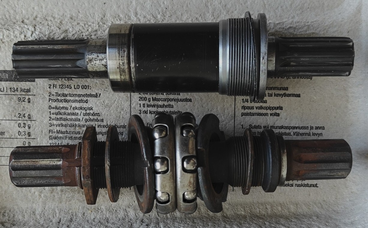 Kuvassa alhaalla irtolaakereilla toinen kampikeskiö, joka on sen normaalin 19mm. Näiden kammet eivät myöskään sovi ristiin.