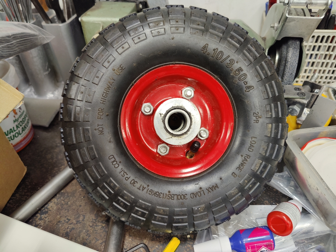 Nyt tarvitaan ehdotuksia. Miten kiinnitetään tuollainen kottikärryn vanne akseliin kiinteästi, mutta irroitus mahdollisuudella?