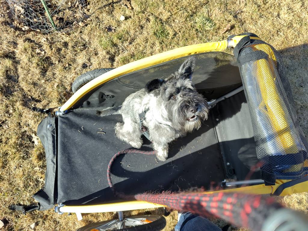 Samoin löytyy yksi valkoinen ylämaanterrieri joka hyvin matkustaa vastaavassa korissa tarakalla. Pentuna meni etukorissa mutta eihän se sinne kauaa mahtunut... omat koirat taitaa olla jo liian vanhoja korikyytiin, Bob Yak -koria olen kyllä miettinyt mutta on jäänyt toteuttamatta.