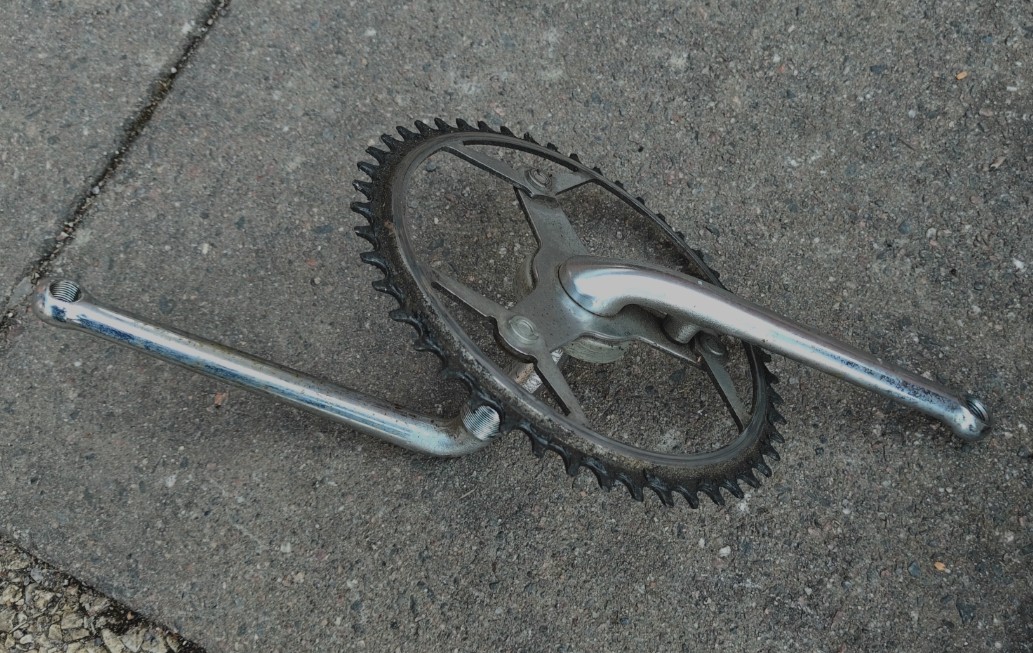 Mikä ihmeen kampiakseli tämä on? Noin pitkä. Ei kai se voi kestää mitenkään polkea päästä, missä saakka se pää sitten onkaan...