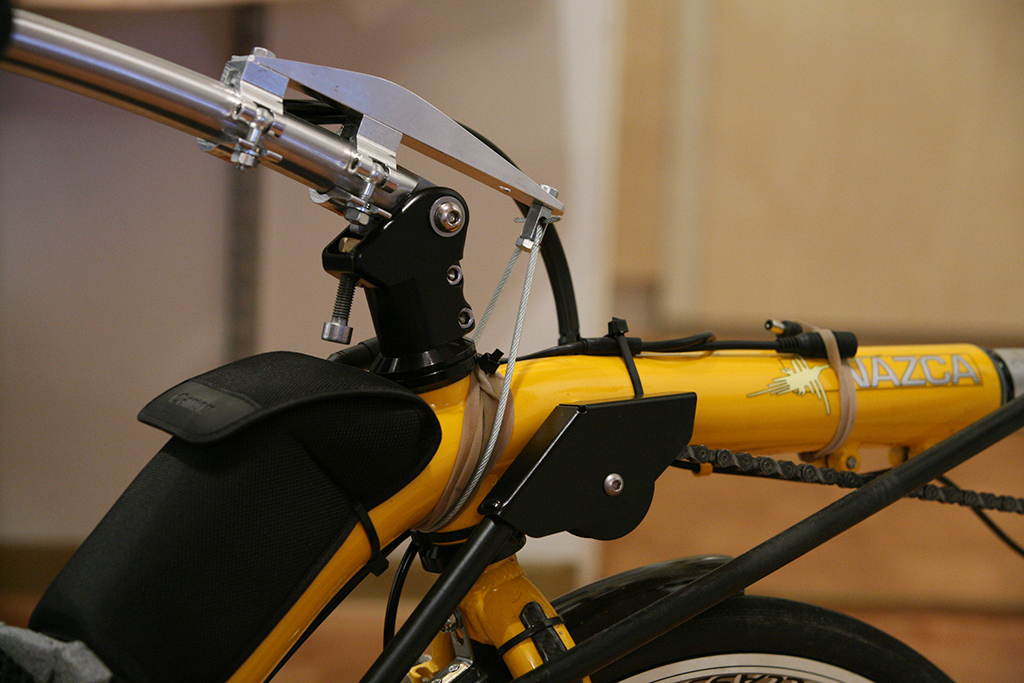 Väsäsin tuommoisen virityksen. Taittuvan stemmin jatkeeksi tehtyyn varteen kiinnittyy muovipäällysteinen vaijerilenkki, joka kiertyy etuhaarukan kaulan takaa runkoputken ali. Ideana on säätää stemmin asennolla ohjausherkkyyttä "livenä ". Ohjaustankoa alas painamalla vaijeri kiristyy ja ohjaus jäykkenee. Vaijeri ei tapaa suoraan runkoon vaan väliin on viritetty joustava kitkapinta kumilenkistä. Kumi antaa tarvittavan myötäämisen ja toisaalta eliminoi lepokitkan, jolloin ohjauksessa säilyy tunto jäykkänäkin. Ohjaustankoa ylös nostamalla vaijerilenkki löystyy ja irtoaa kumipinnasta, jolloin sen vaikutuskin katoaa. Olen kruisaillut tämän kanssa nyt ehkä nafti parisataa kilometriä ja väittäisin että idea toimii melko lailla suunnitellusti vaikka toteutus on melko "hatusta". Sitä olisi varaa kehittää mutta tuommoisenakin ajaa tarkoituksensa, joka oli nimenomaan levollisempi mieli alamäessä. Kovassa kyydissä tulee muutenkin puristettua tankoa rystyt valkoisina jolloin sitä alitajuisestikin painaa alas. Hiljaa taiteillessa taas tulee tankoa (ja asentoa) helposti nostettua pystymmäksi. Periaatteessa vaijerilenkissä olisi hyvä olla pituuden hienosäätöruuvi mutta taittuvan stemmin alarajoitusruuvilla saa ohjauksen maksimijäykkyyttä passattua ihan hyvin lennossakin, kunhan vaijerin pituus on about kohdallaan. Ohjaustangon ylä/ala-liikealue, jolla jäykkystuntuma muuttuu merkittävästi, on oikeasti maksimissaan senttejä ja on mielestäni hyvinkin luontevan oloinen käyttää. Että tämmönen. Toisaalta aion kyllä vakavissani asentaa koko ohjauksen persiin alle, jolloin tämä keksintö jäänee tarpeettomaksi. Yläohjaus on mielestäni vähän vikuri alaversioon verrattuna, tosin alohjauskokemukseni on vielä vähäistä. Ajatuksena tuo on nyt jäänyt kuitenkin häiritsevästi pyörimään mieleen. Kiinnostaisi kokeilla irrottaa vaimennusmekanismi jostain hyvästä videokameran nestepäästä ja kokeilla soveltaa sitä. Niissä on jotain paksua liisteriä sisällä jolla saadaan pehmeä ja elegantti vaimennus niveleen.
