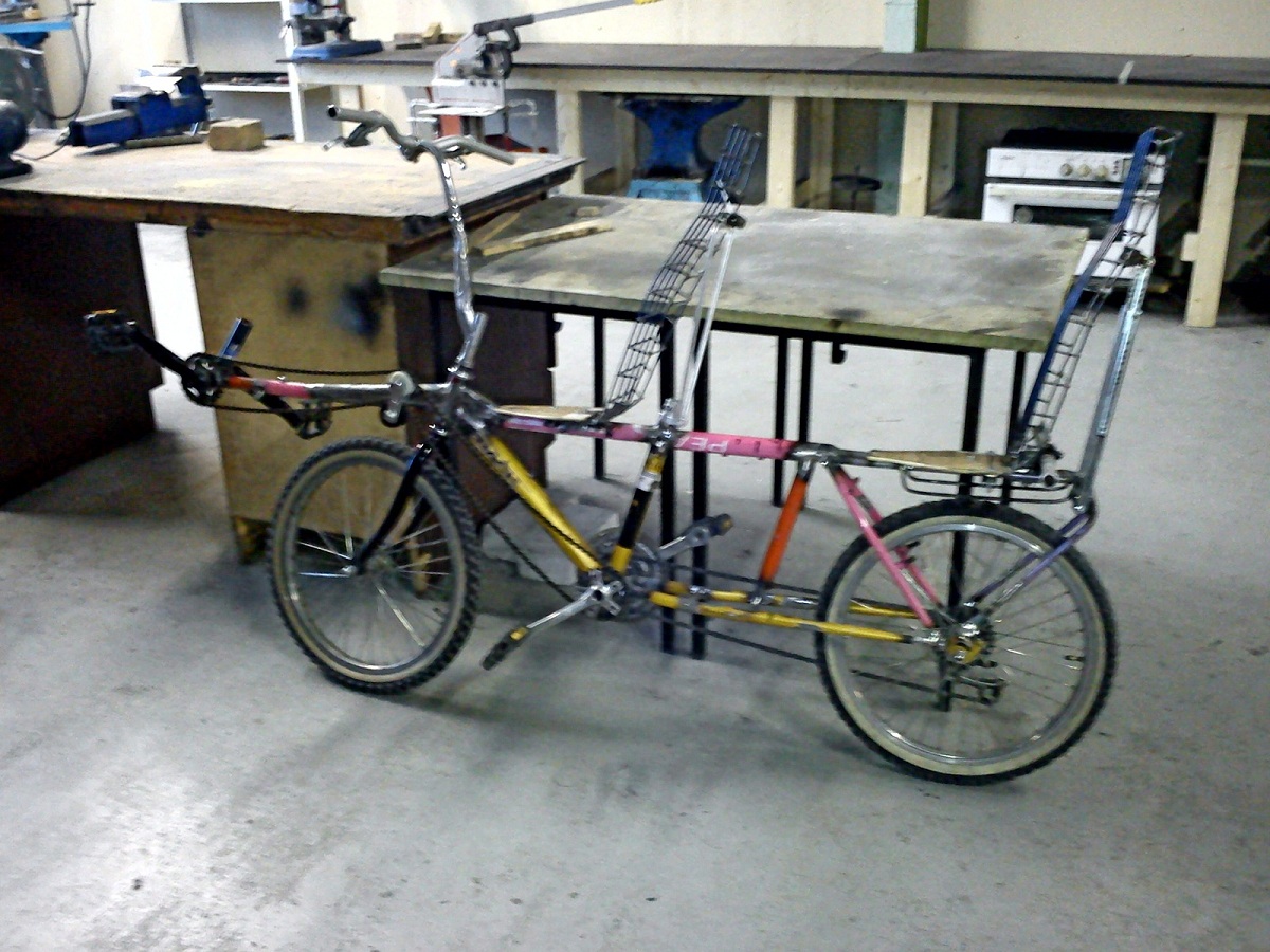 Eikö kannattaisi tehdä tandemi (Januksena). Akseliväli saataisiin lyhyenmäksi ja ajajat pystyisi tarvittaessa keskustelemaan helposti keskenään. Huonopuoli on se tietysti että ei nä mitä erestä tulee kun istuu selkä menosuuntaan. Hyviä puolia on ainakin se että ketjulinjat saadaan lyhyiksi , kun kumpikin polkee omaa päätyä. Runko on helpo tehdä jäykäksi ja ennen kaikkea , kun polkee tiellä , ei huomio muilta liikkujilta jää vähäisiksi. Taitaisi olla Suomen ensinmäin Janus jossen väärin arvaa.