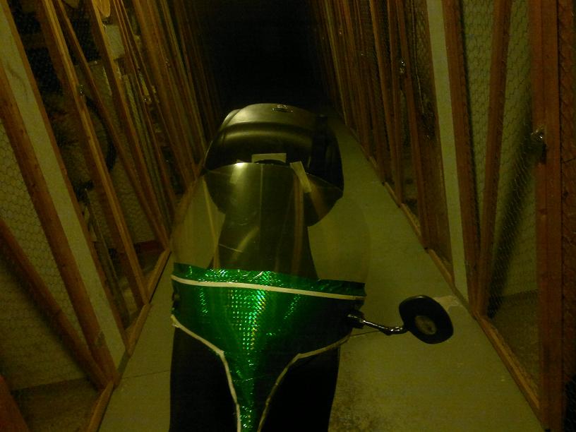Yksi hyvä pointti askarteluun on, että kaikkea pitää kokeilla :) Kissaniityn pyörässä olevan kaltainen iso tuulilasi/etukate olisi kyllä hyvin suojaava mutta sellaisen kanssa en mahdu varaston ovesta ja jos omatekeleen lopullinen vesio olisi vaikka hm... urheilullisen näköinen :P