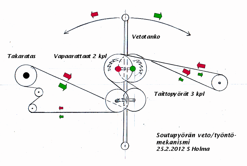 Punaisella on nyt merkitty ketjun kulkusuunnat vetovaiheessa ja vihreällä työntövaiheessa. Työvaiheessa olevat ketjut on merkitty suuremmalla nuolella. Ne vapaarattaat, jotka ovat kulloinkin työssä on merkitty sen työvaiheen värillä. Hahmotusta helpottaa, kun ajattelee vetotangon muuttuvaa etäisyyttä takarattaasta ja etutaittopyörästä. Jokohan selviäisi!
