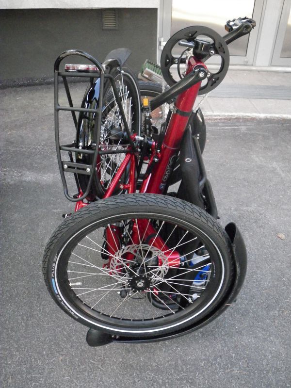 Taittaminen on HP-Velotechnikin sivuilla saatu tosi helpon ja nopean näköiseksi. On se sitä käytännössäkin, kunhan pyörän painon piteleminen suorilla käsivarsilla ei ole ongelma.
